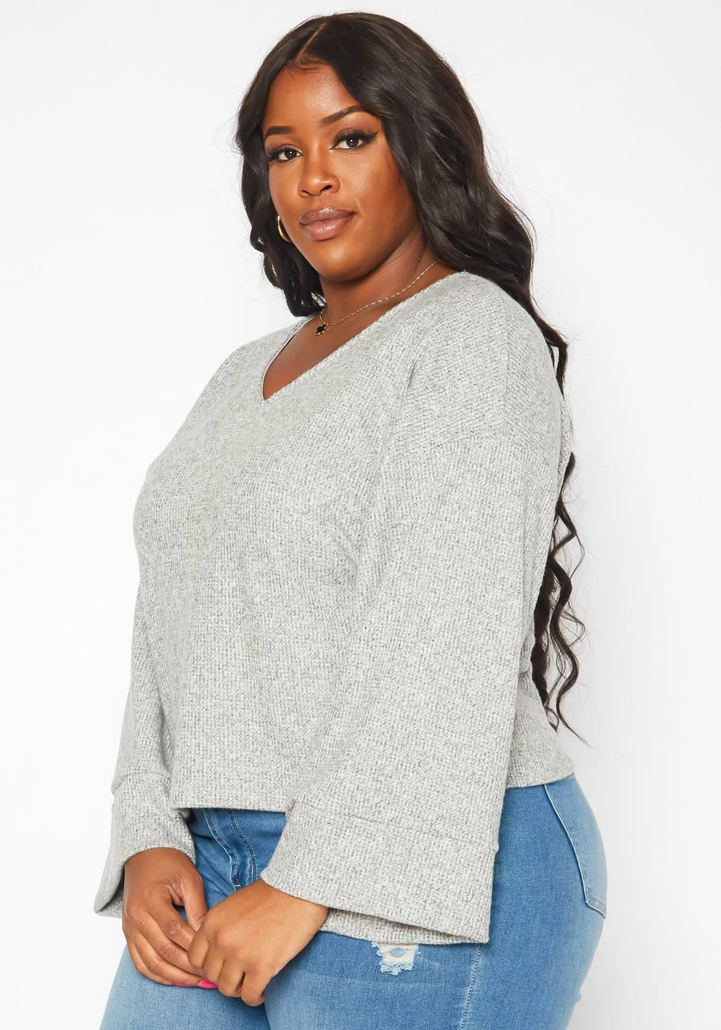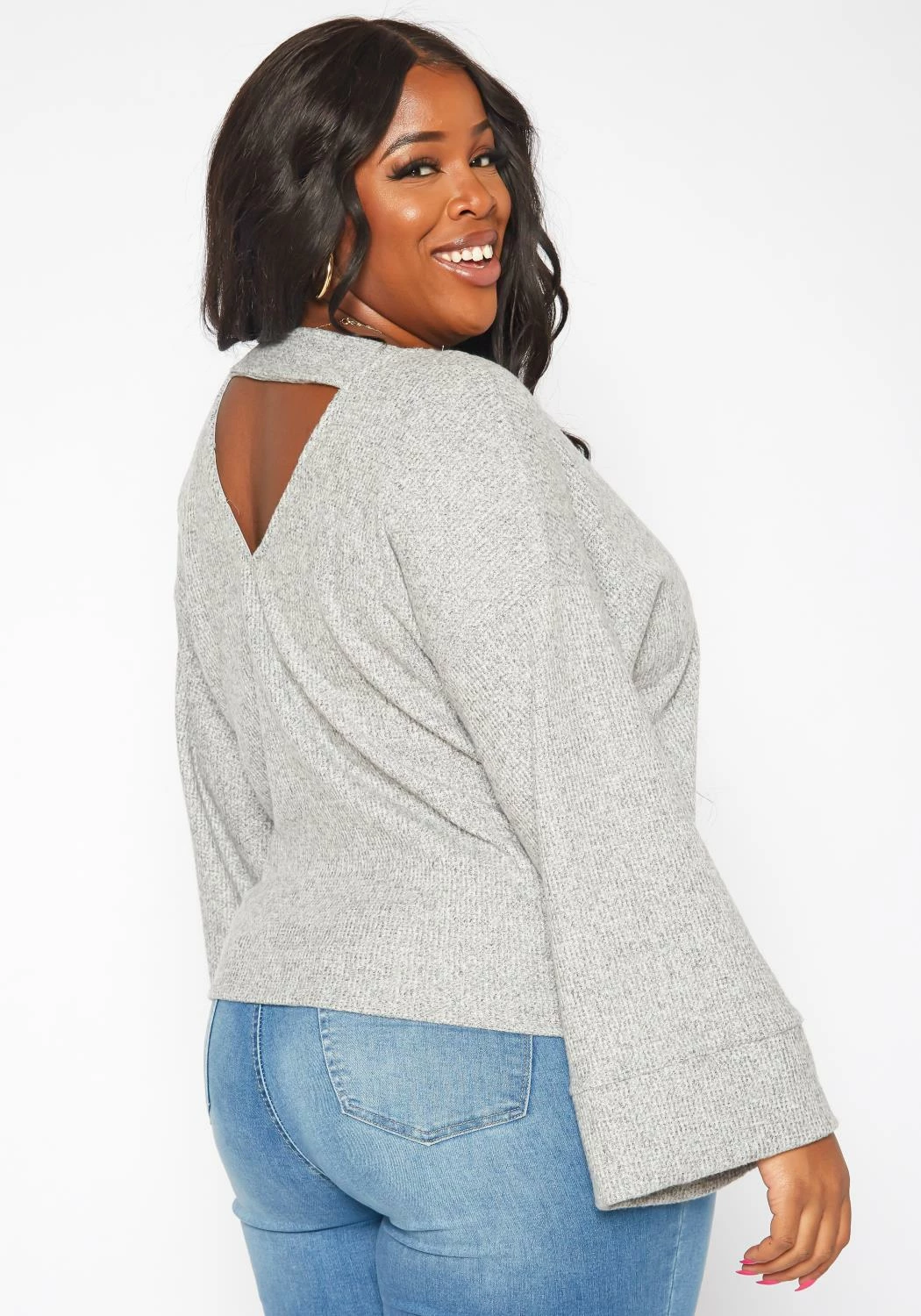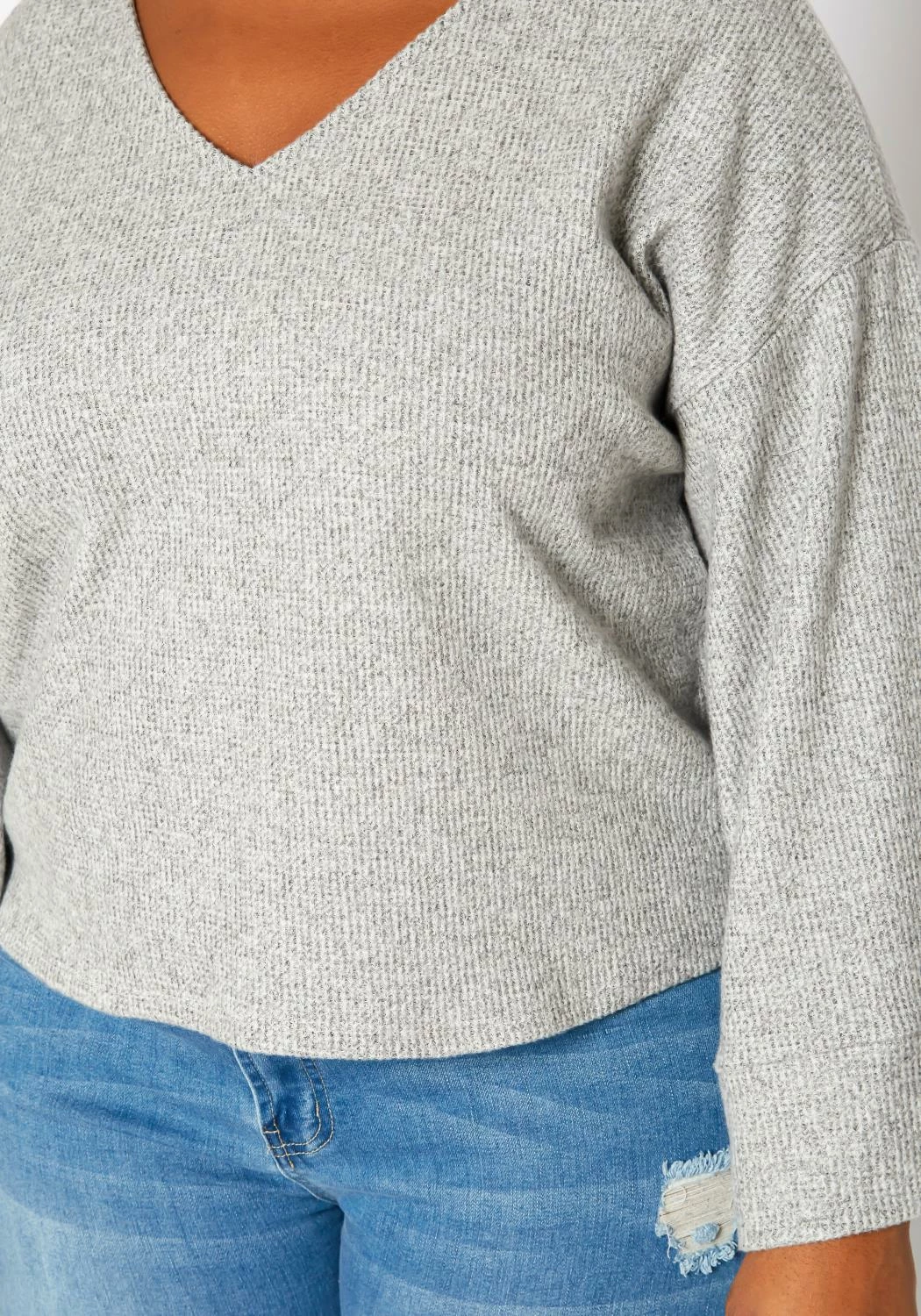 Casual plus size women’s sweater in v-neck style, relaxed fit, open back and loose long sleeves.