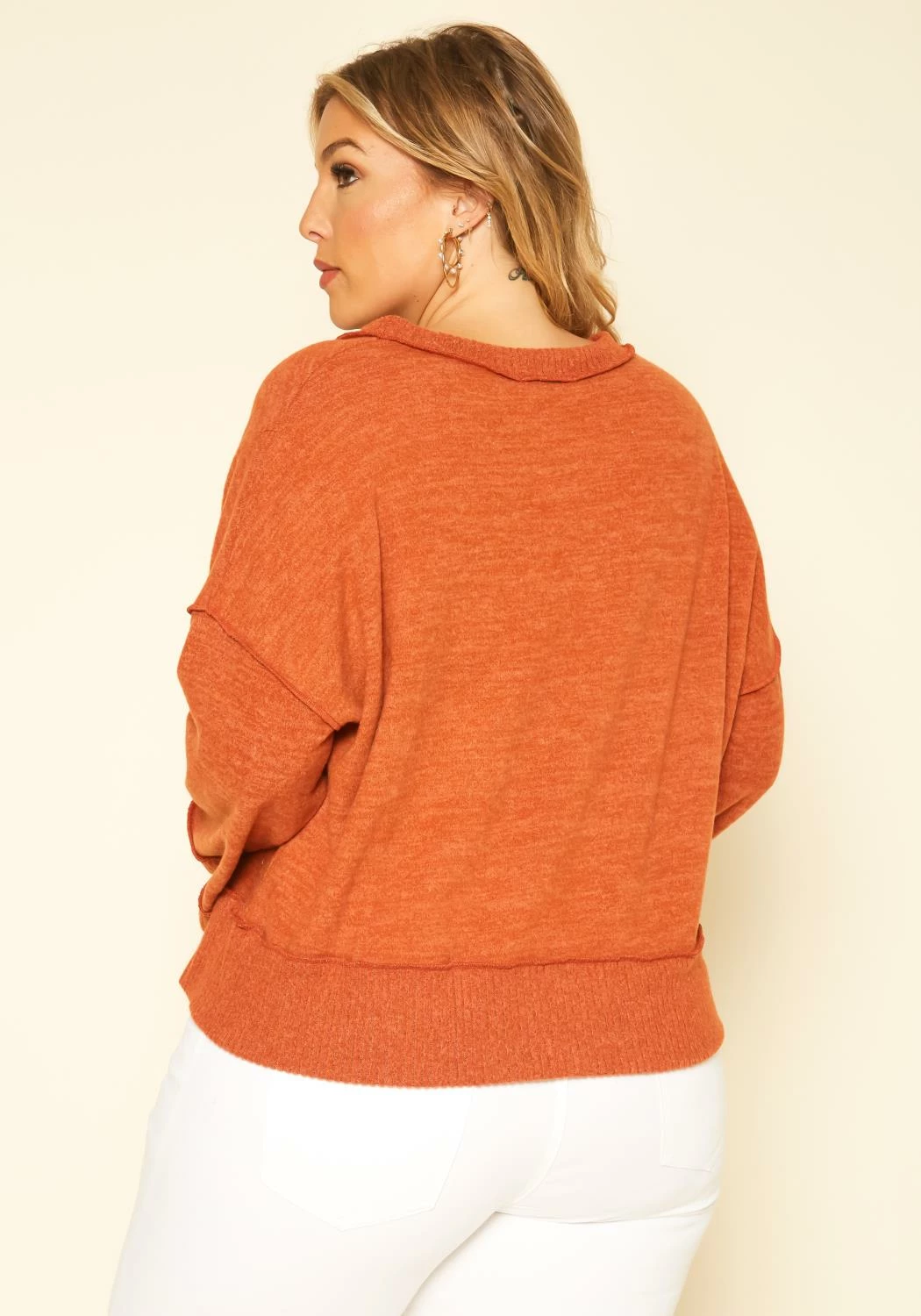 Casual plus size women’s sweater in v-neck style, relaxed fit and loose long sleeves.