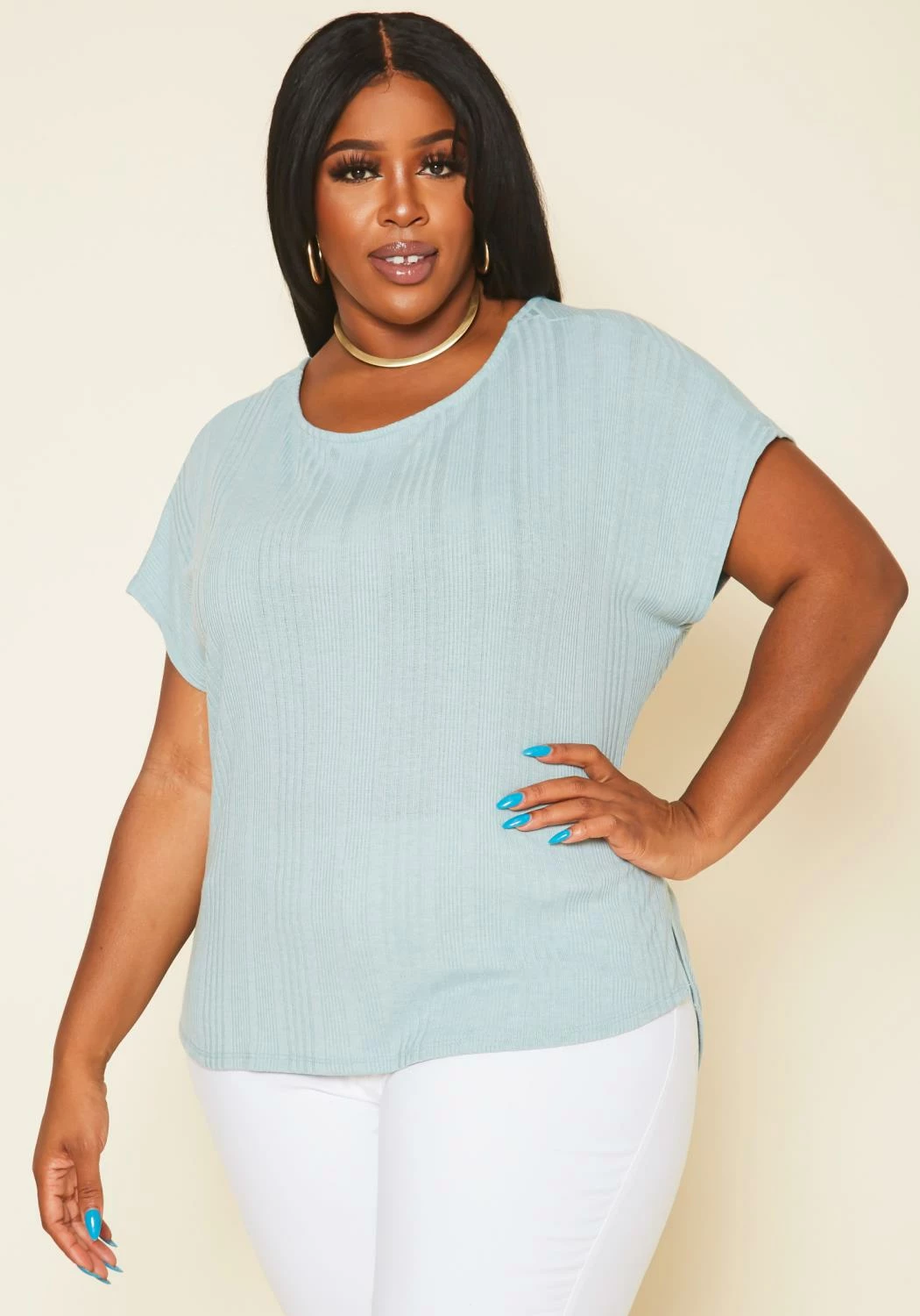 Casual plus size women’s top with ribbed material, round neck style, dolman short sleeves and back twist hem design.