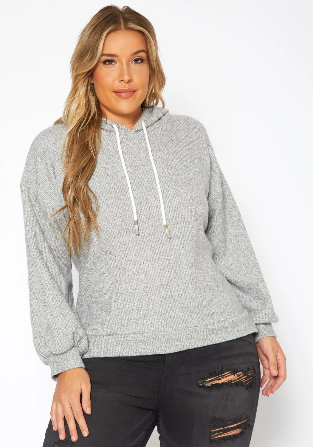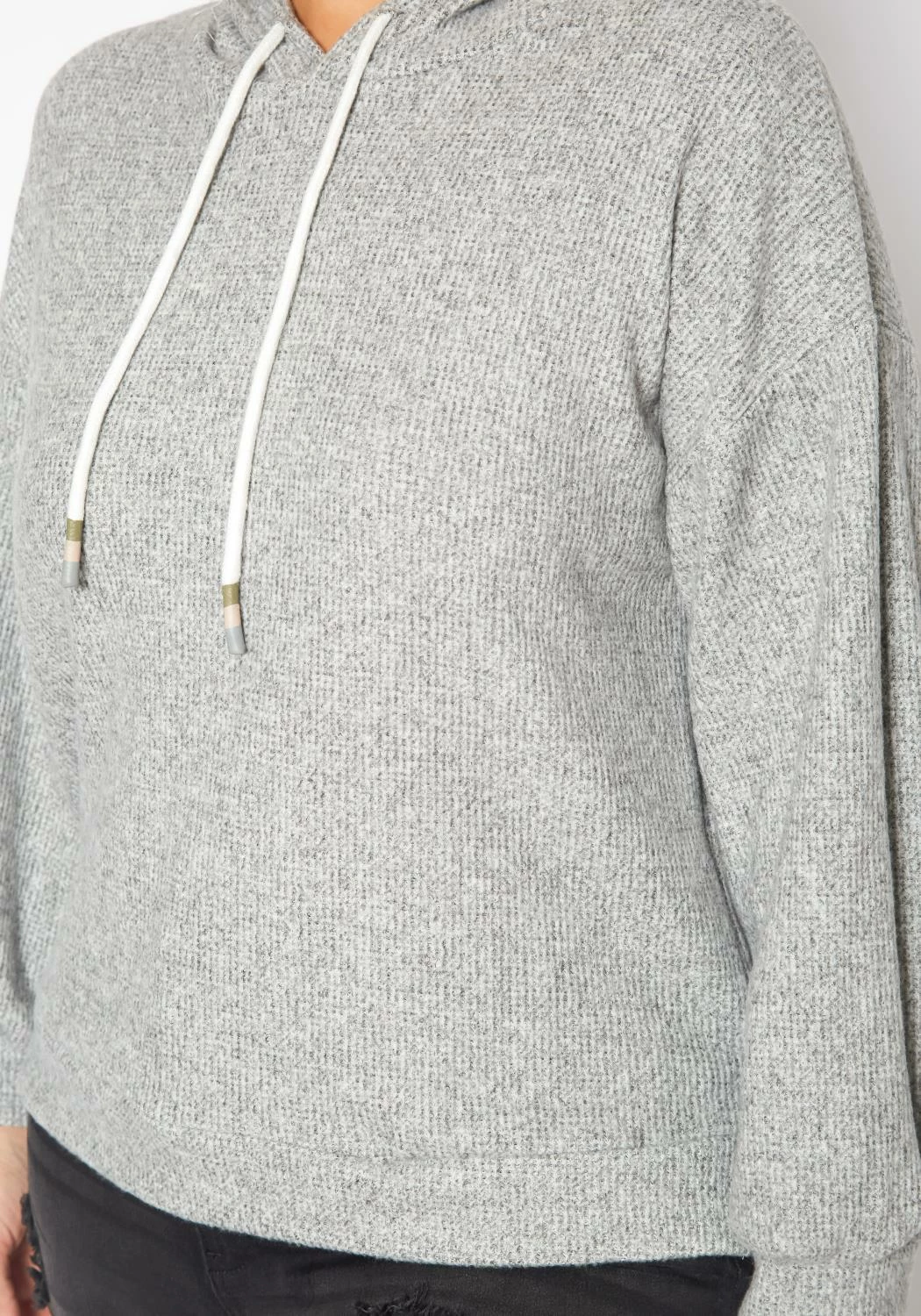 Cozy casual plus size women’s hooded sweater in ribbed knit material, hooded design with drawstring hem and fitted wrist cuffs.