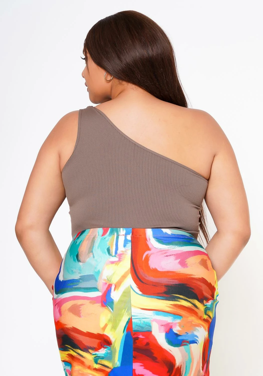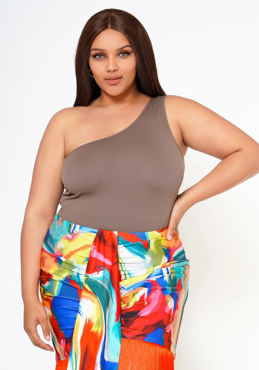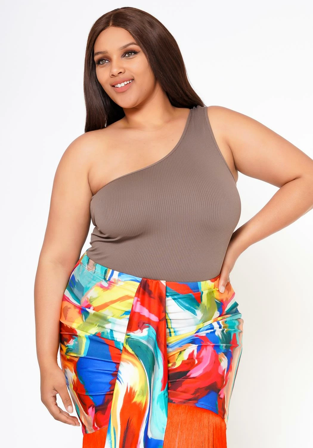 Must have plus size women’s one sleeve bodysuit in ribbed knit material. Available in versatile colors to easily pair with most of every bottom.