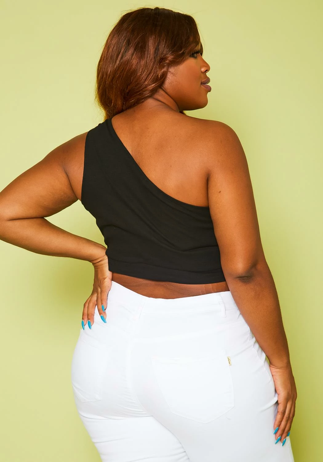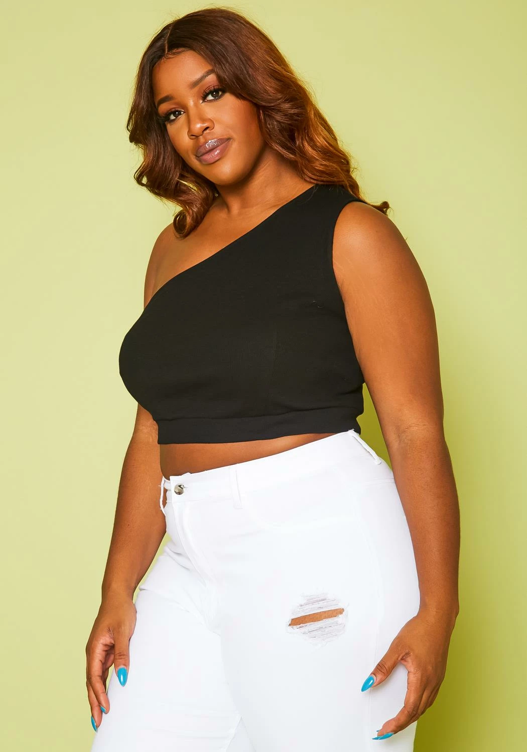 Basic plus size women’s top, featuring ribbed material, crop top & one sleeve hem.