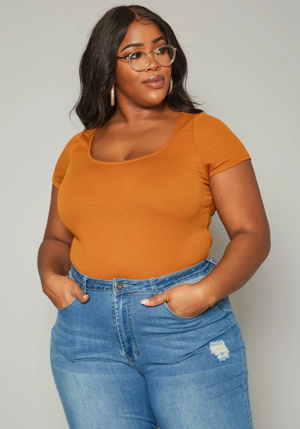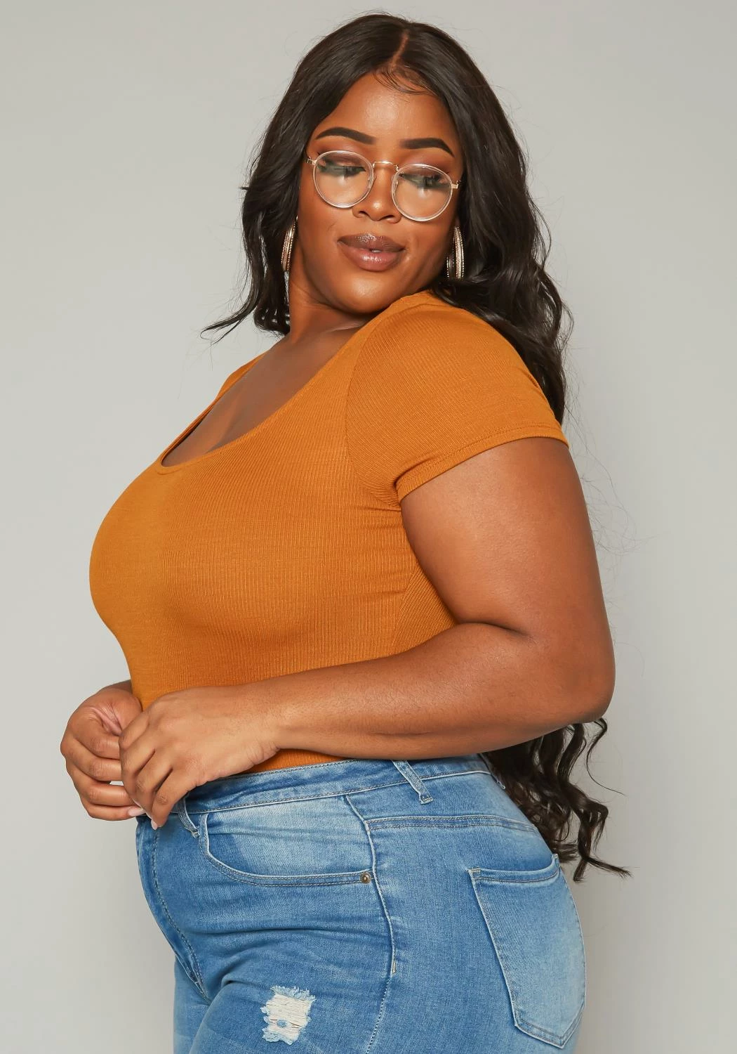 Must have plus size women’s bodysuit in ribbed material, scoop neck style, short sleeves and snap button closure.