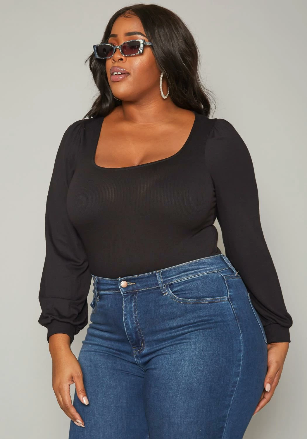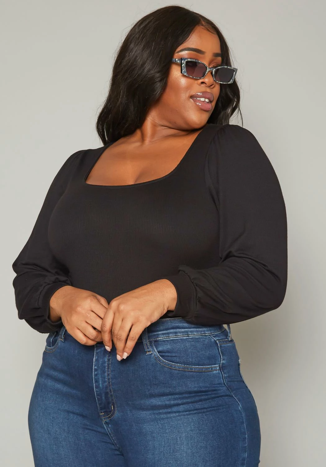 Must have plus size women’s bodysuit in ribbed material, square neck style, long sleeves and snap button closure.