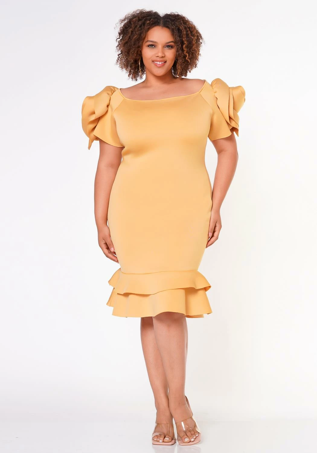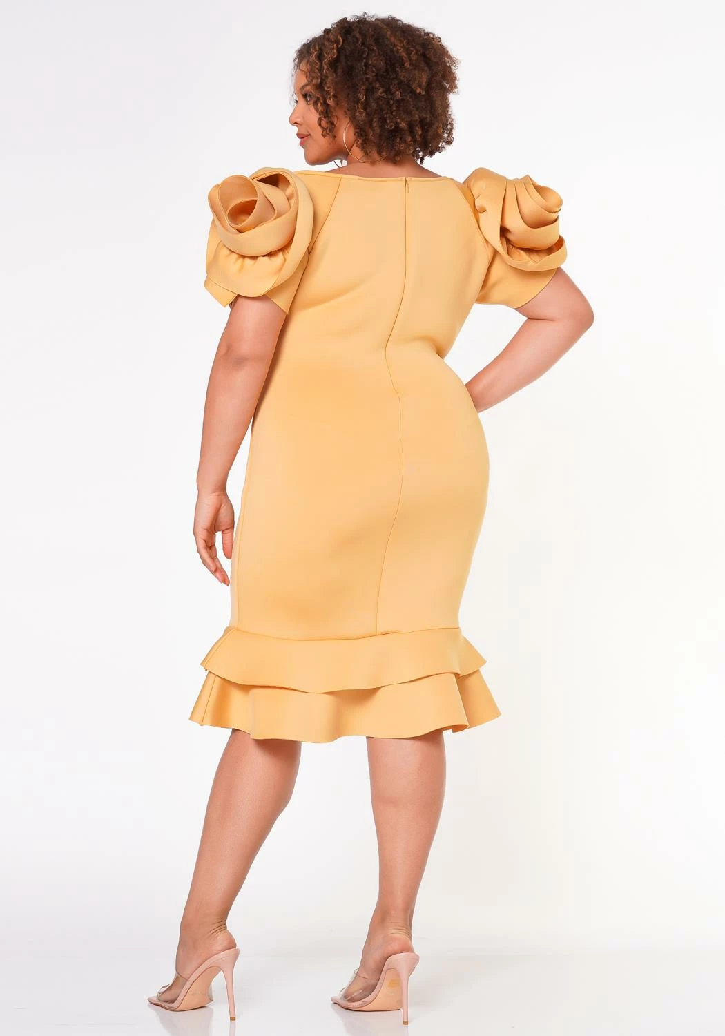 Plus size women’s dress in midi style featuring a square neck hem, rose ruffled detailed sleeves, bottom ruffle detail and back zipper closure.