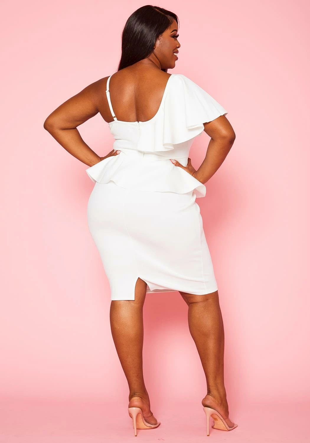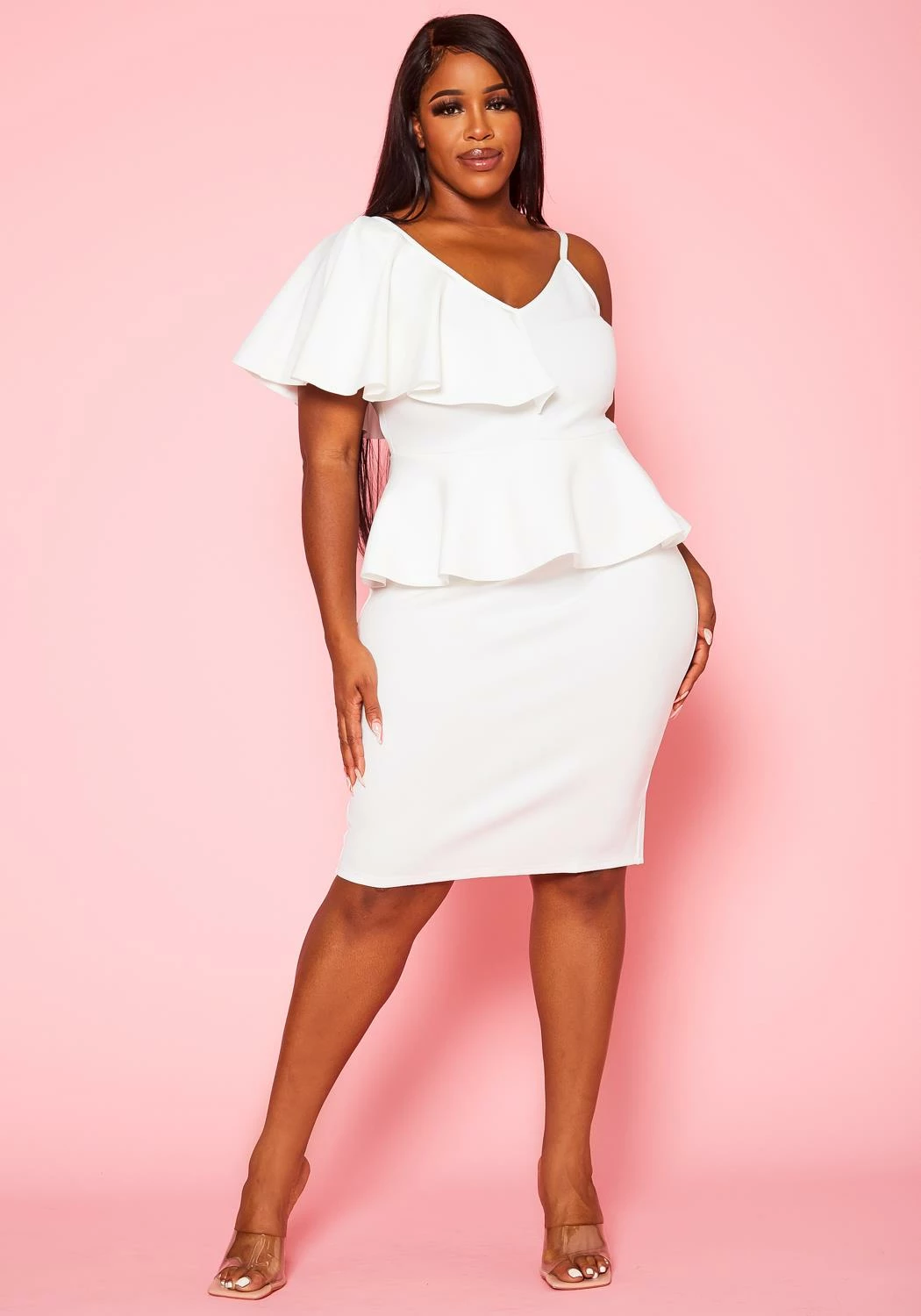Plus size women’s mini dress in ruffle hem design, v-neck style, cami shoulder strap and bodycon fitting.