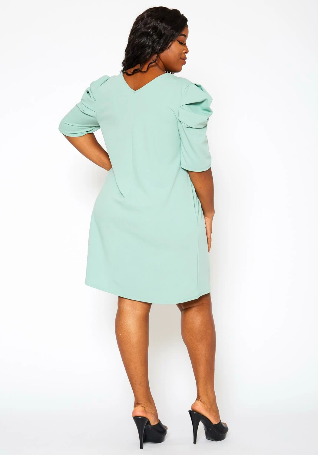 Casual fashion statement plus size women’s mini dress in round neck style, ruffle short sleeves and flare design.
