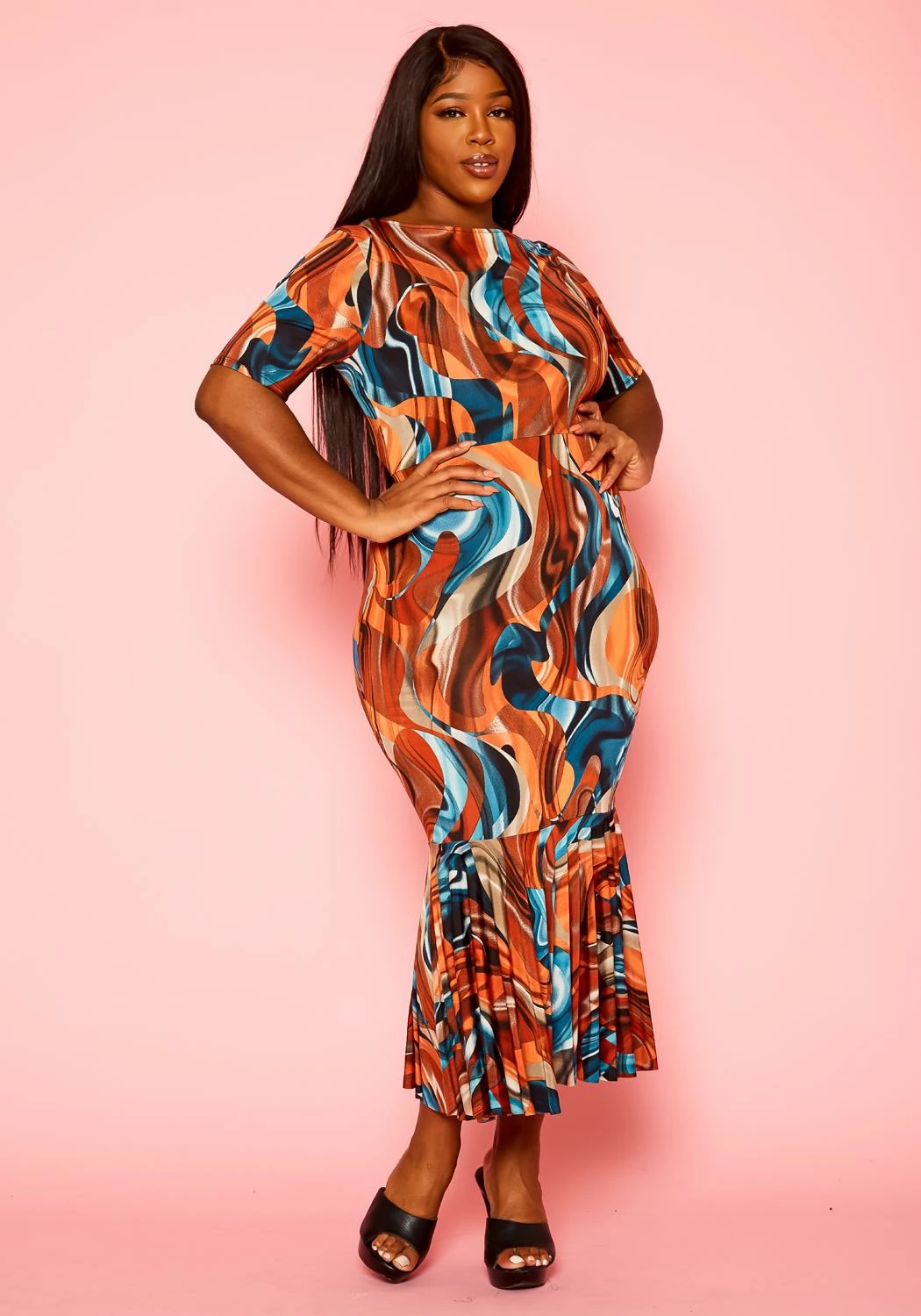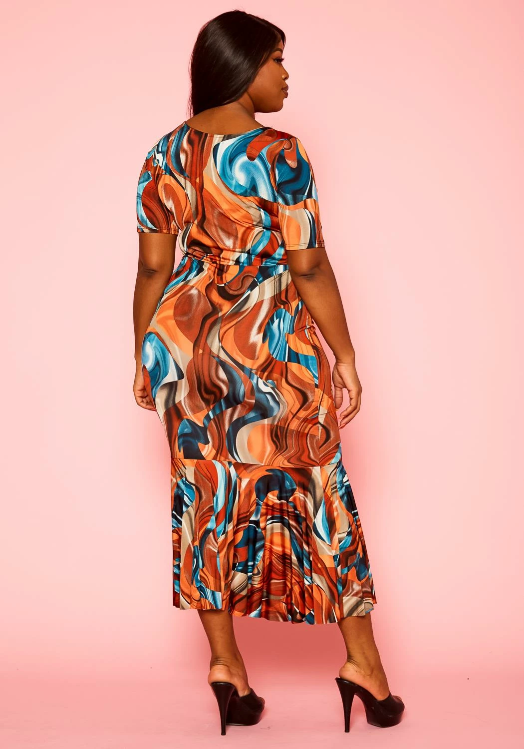 Absolute favorite dress for plus size women in rust abstract pattern, round neckline, short sleeves and mermaid flare hem.