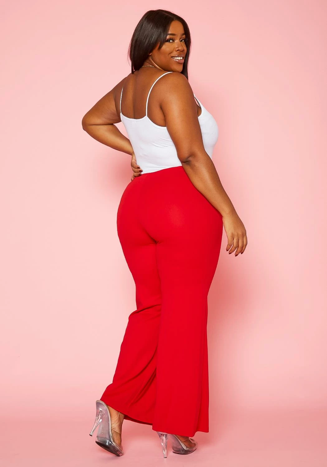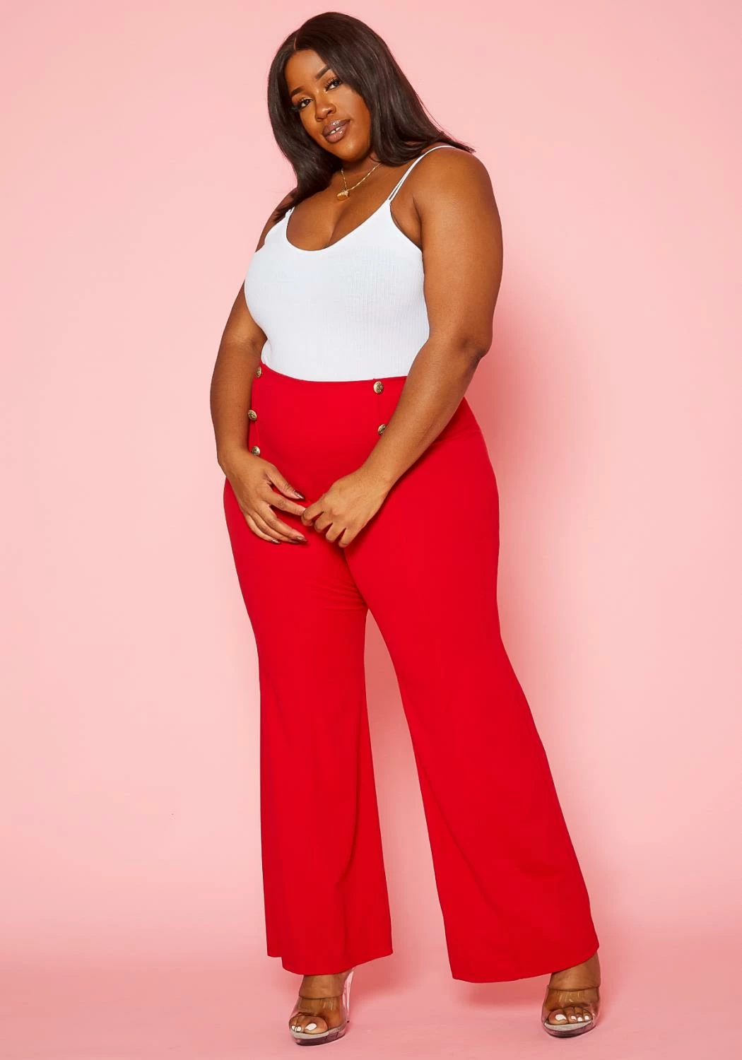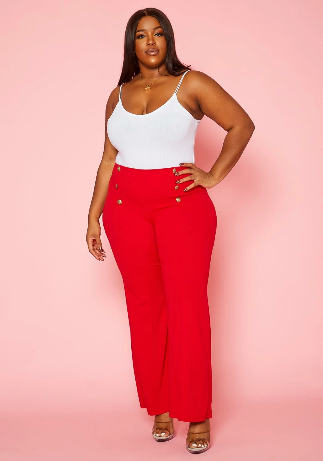 Chic plus size women’s trouser pants with gold sailor button details, high waist style, flare leg hem and stitch hem.
