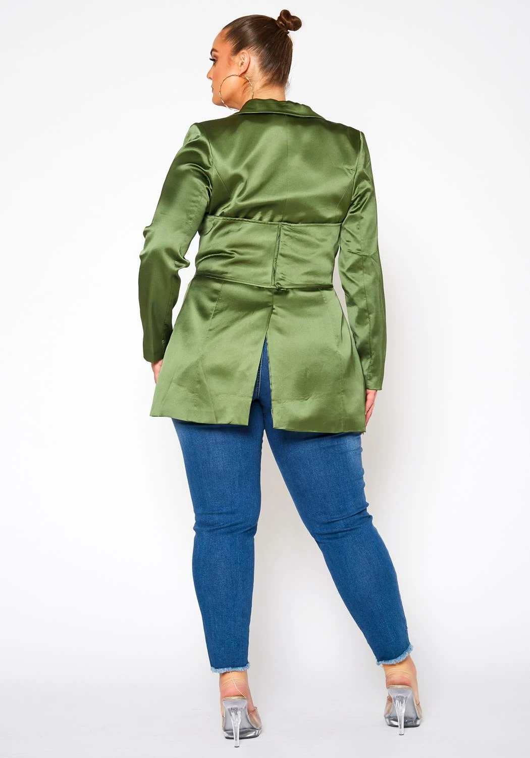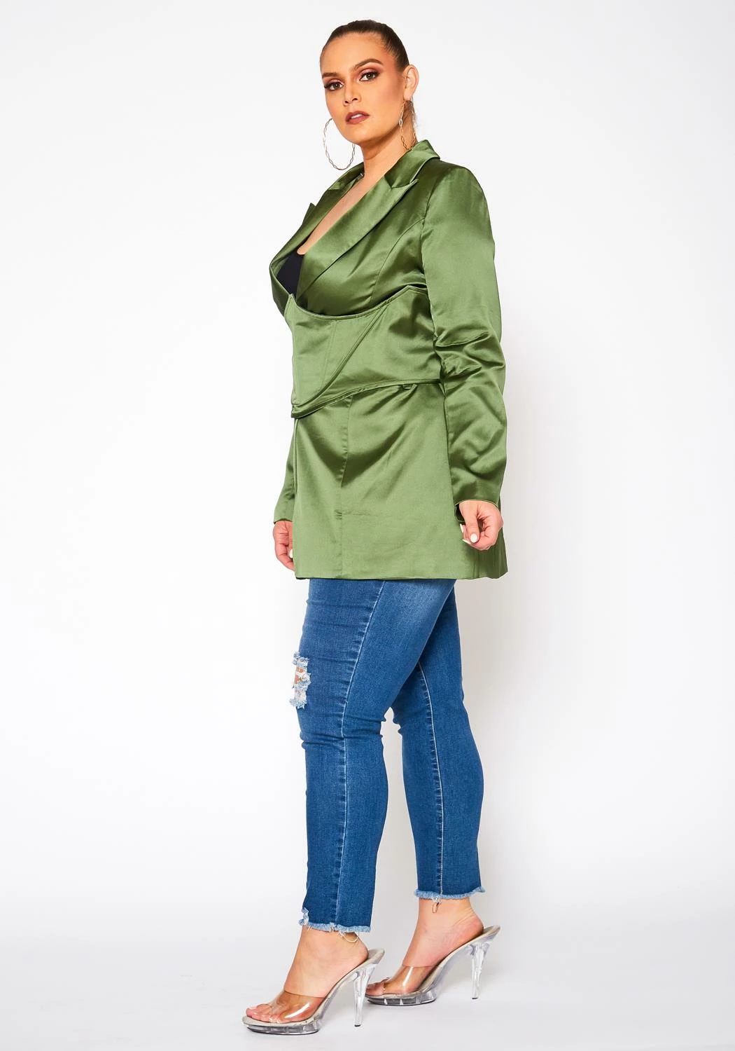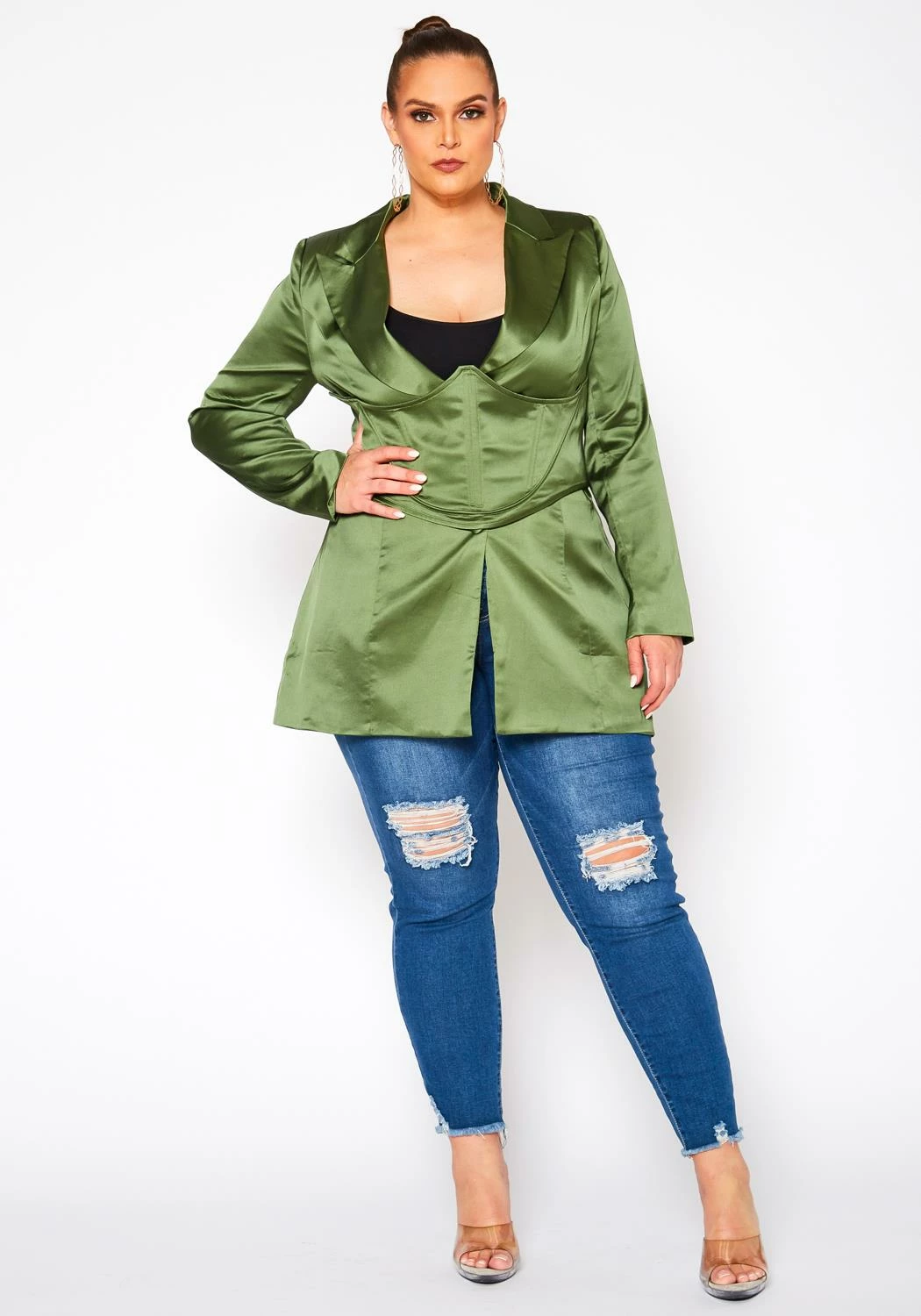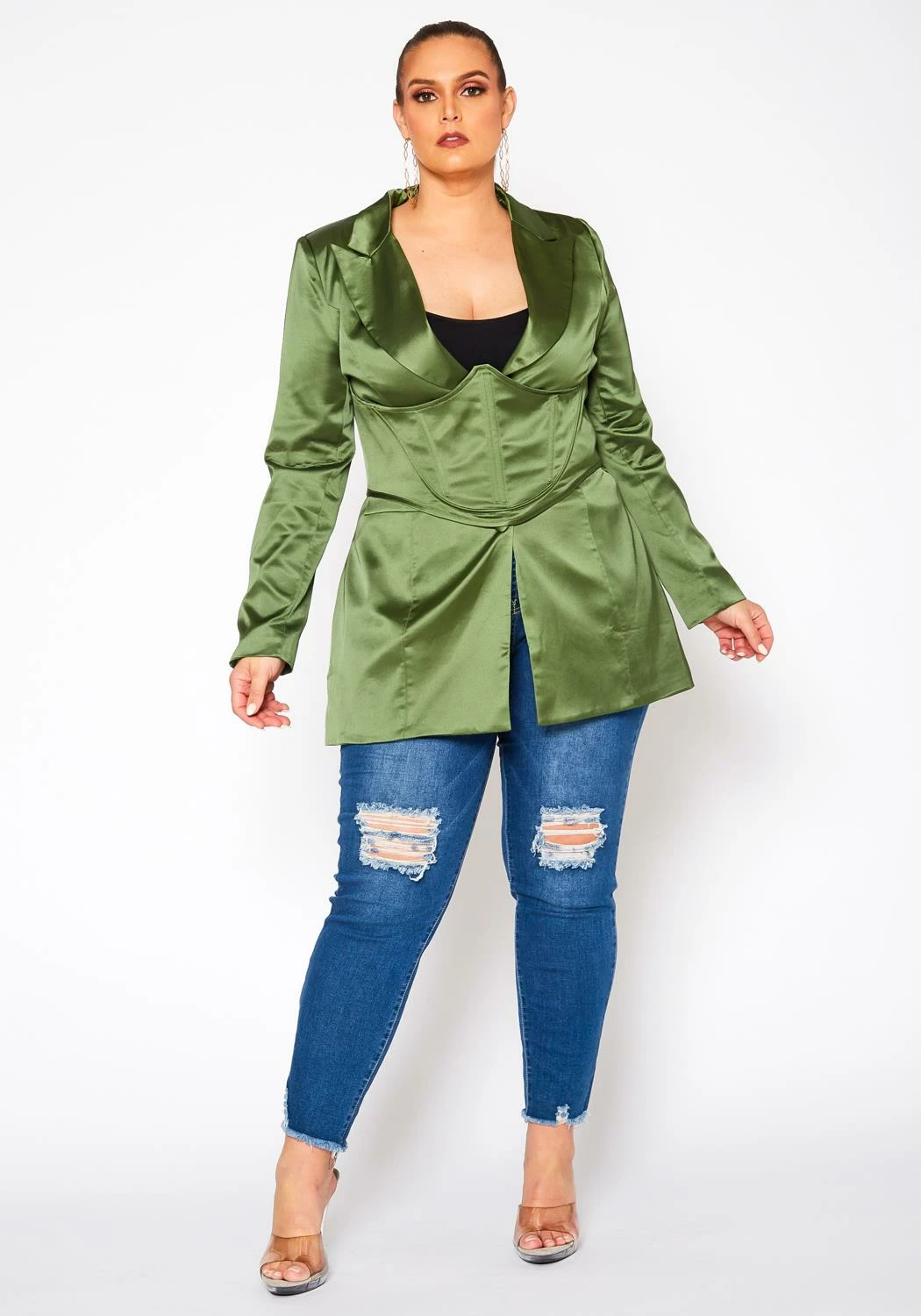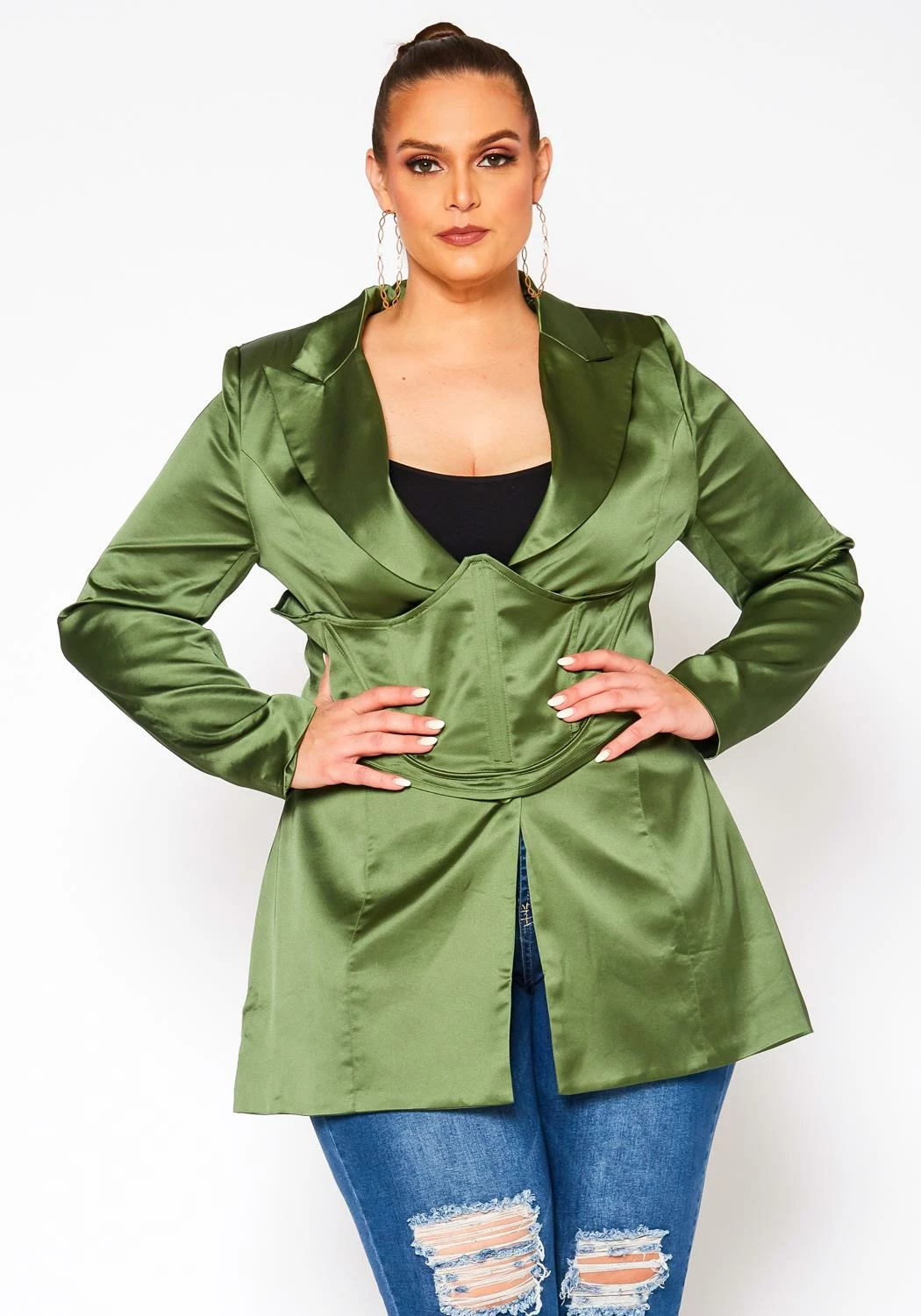 Fashionable satin two piece set for plus size women which features a notch collar blazer and zipper closure corset.