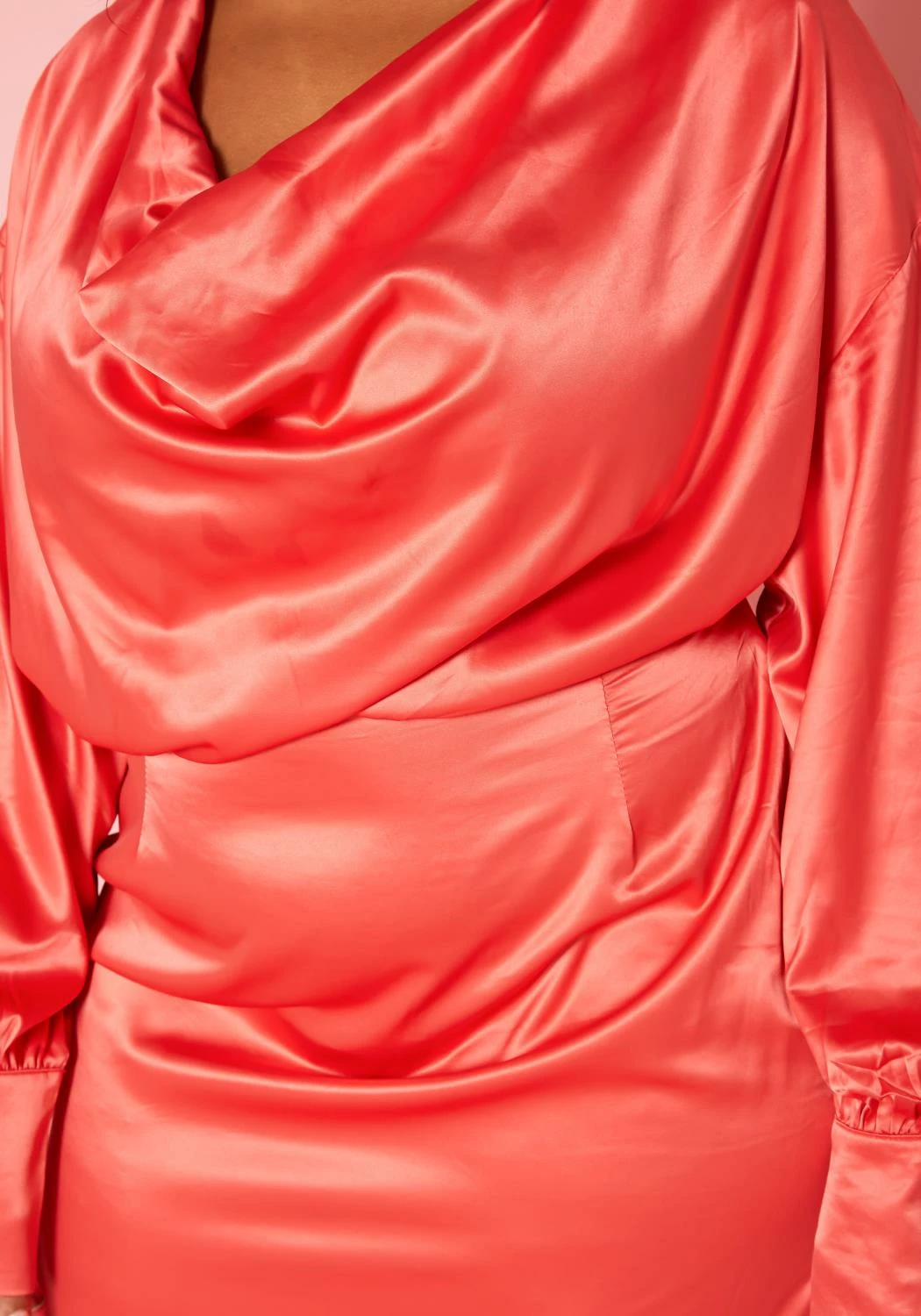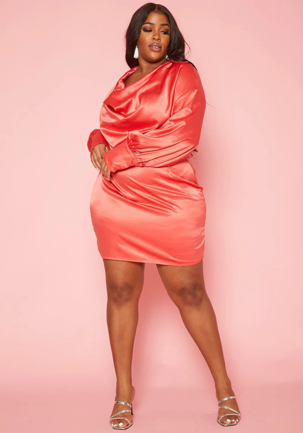Gorgeous plus size women’s mini dress in satin material, cowl neck style, long sleeves, buttoned wrist cuffs and elastic waistline.