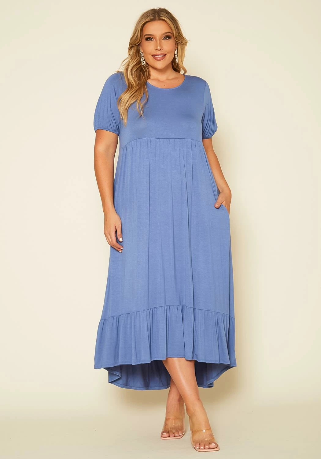 Effortless plus size women’s maxi dress in round neck style, short puff sleeves, ruffle flare hem and fit to flare design.