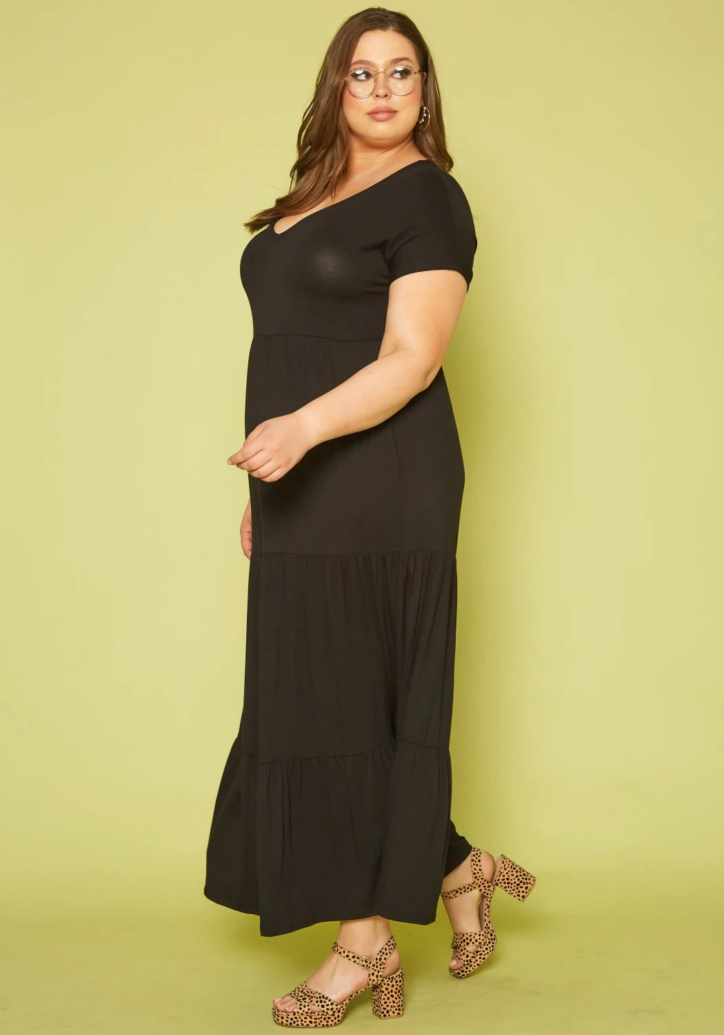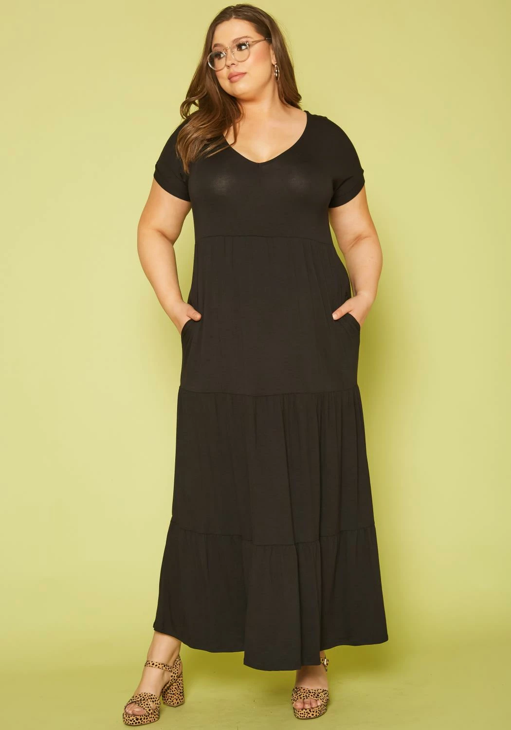 Effortless plus size women’s maxi dress in fit to flare design, v-neck style, short sleeves and tier hem.