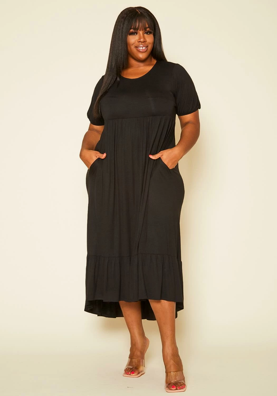 Effortless plus size women’s maxi dress in round neck style, short puff sleeves, ruffle flare hem and fit to flare design.