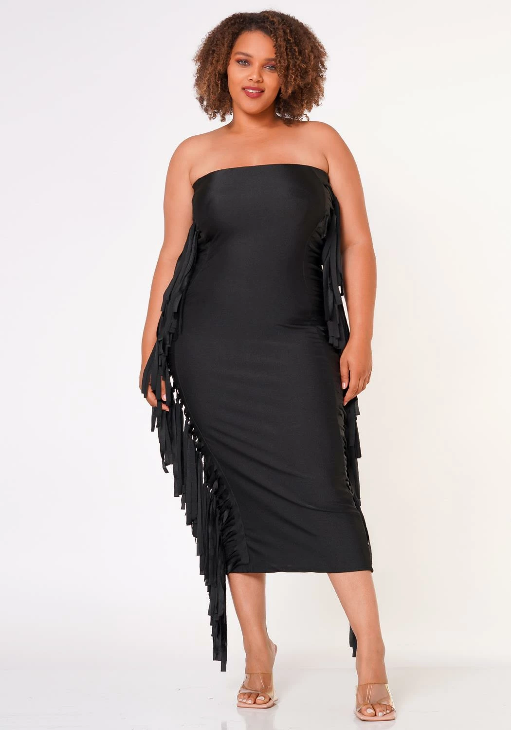 Leveled up plus size women’s bodycon tube dress with double sided fringe hem details and quality sheen material.
