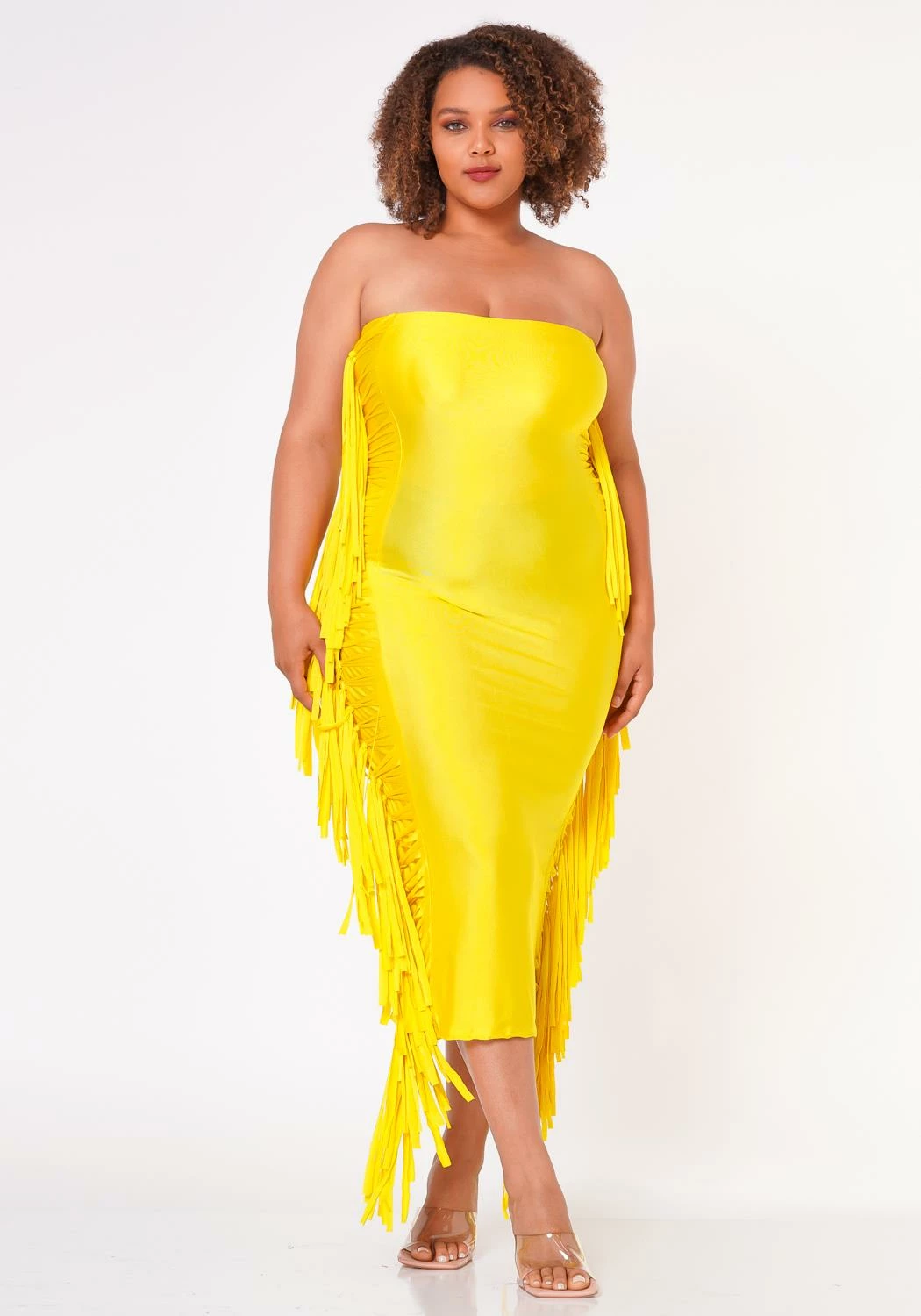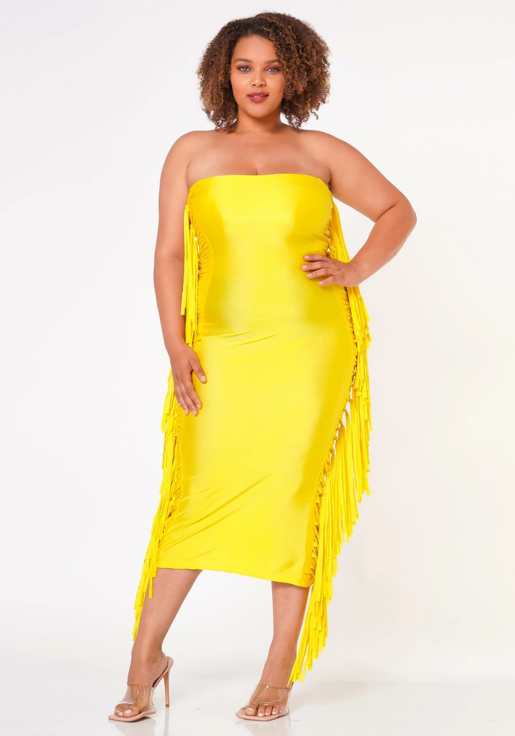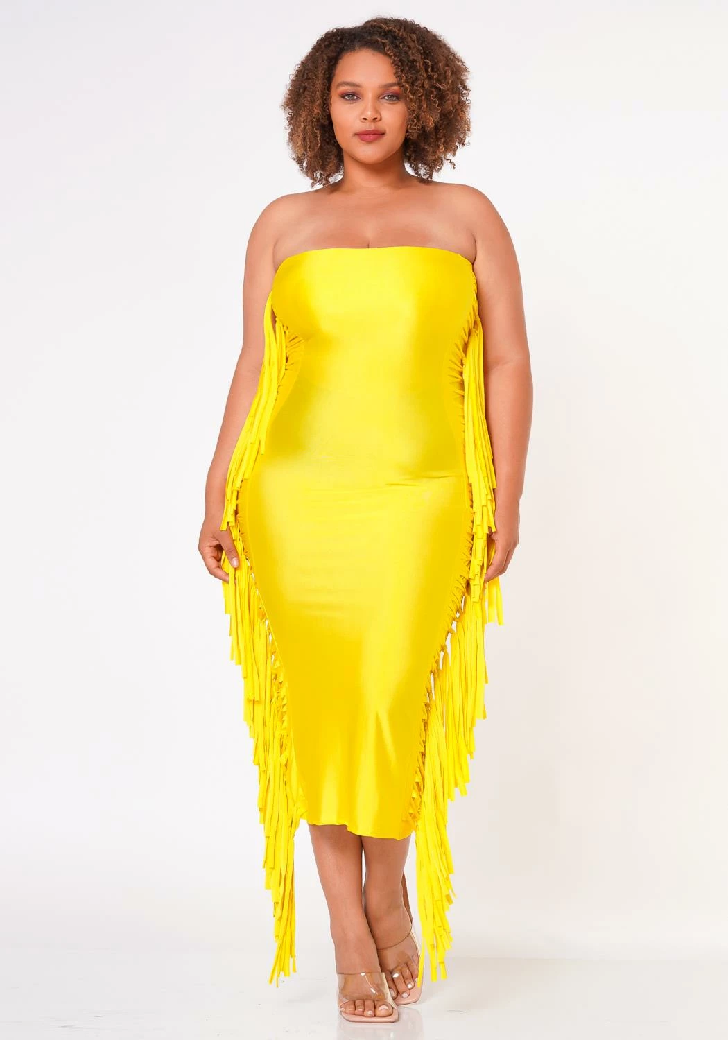 Leveled up plus size women’s bodycon tube dress with double sided fringe hem details and quality sheen material.