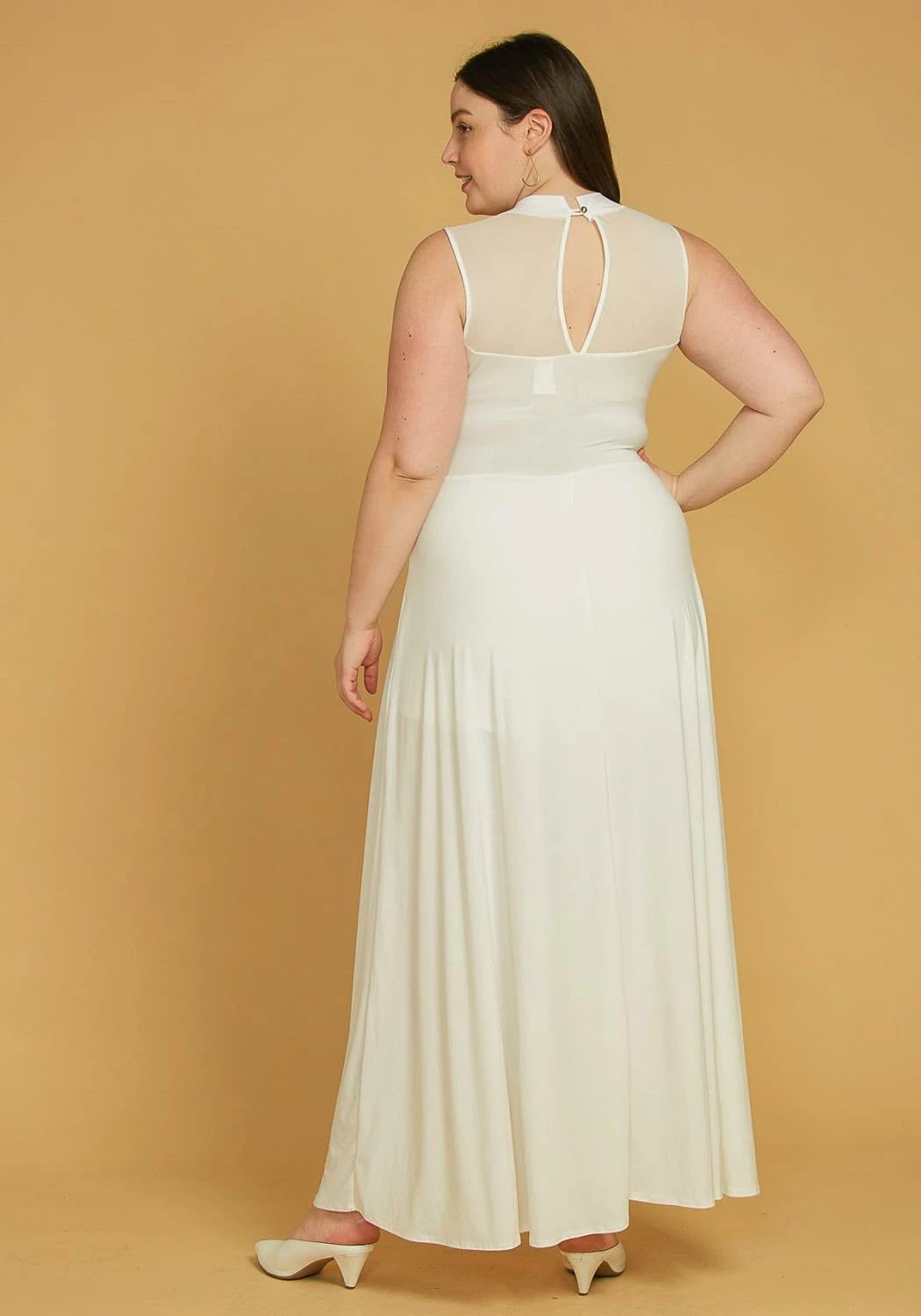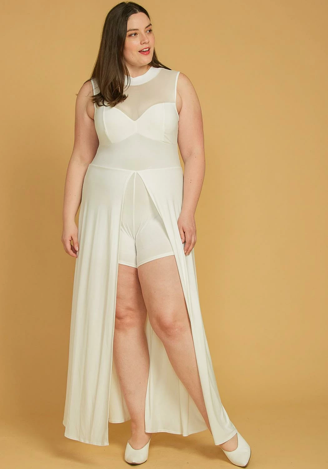 This plus size romper is unique in every way, with its long cape style skirt and illusion neckline.