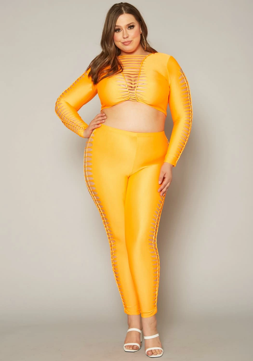 Stunning plus size women’s matching set which features a slit detail long sleeve crop top and side slit detailed high waist leggings.