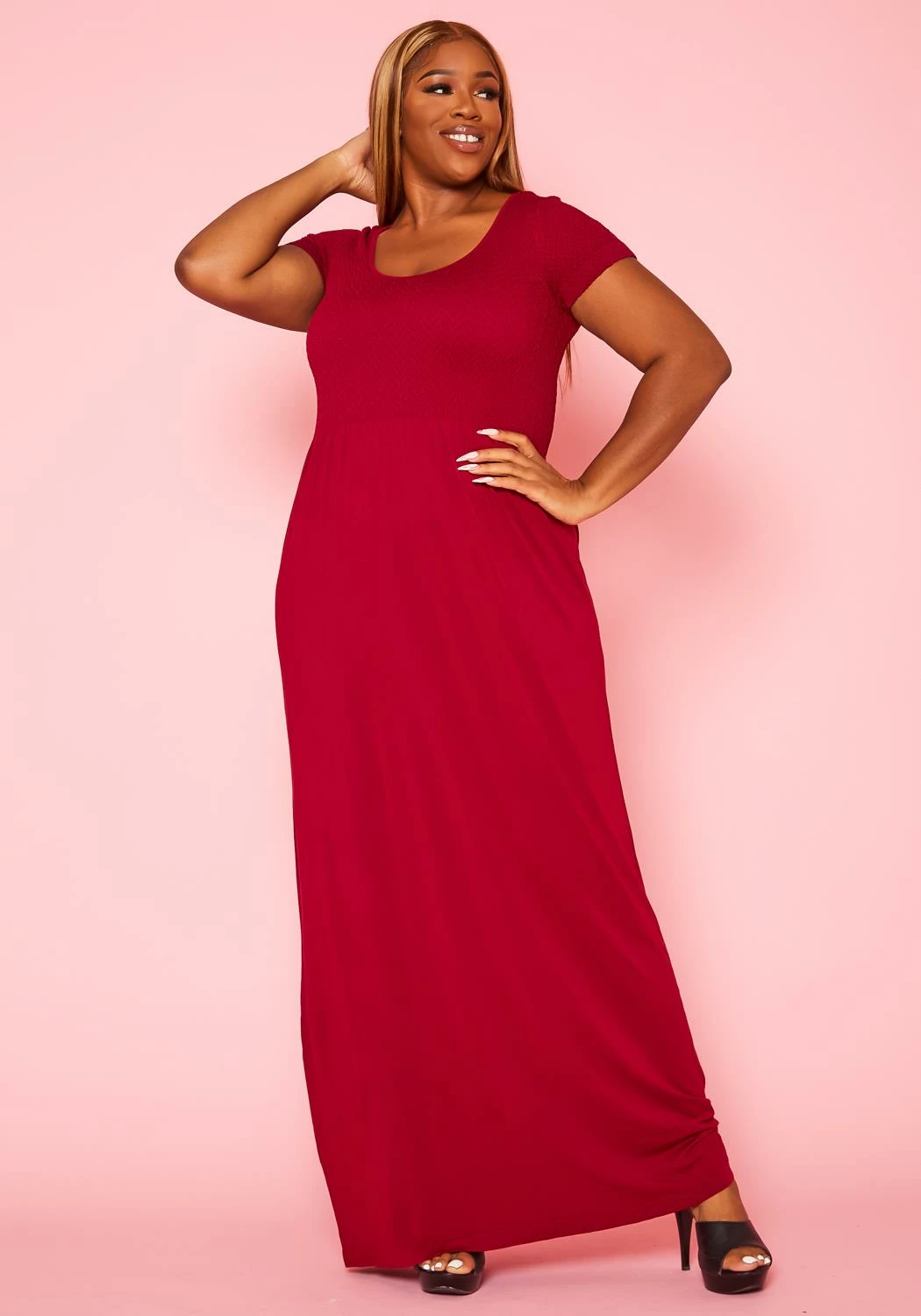 Lovely basic fit & flare maxi dress for plus size women in scoop neck style, short sleeves and smocked hem top.