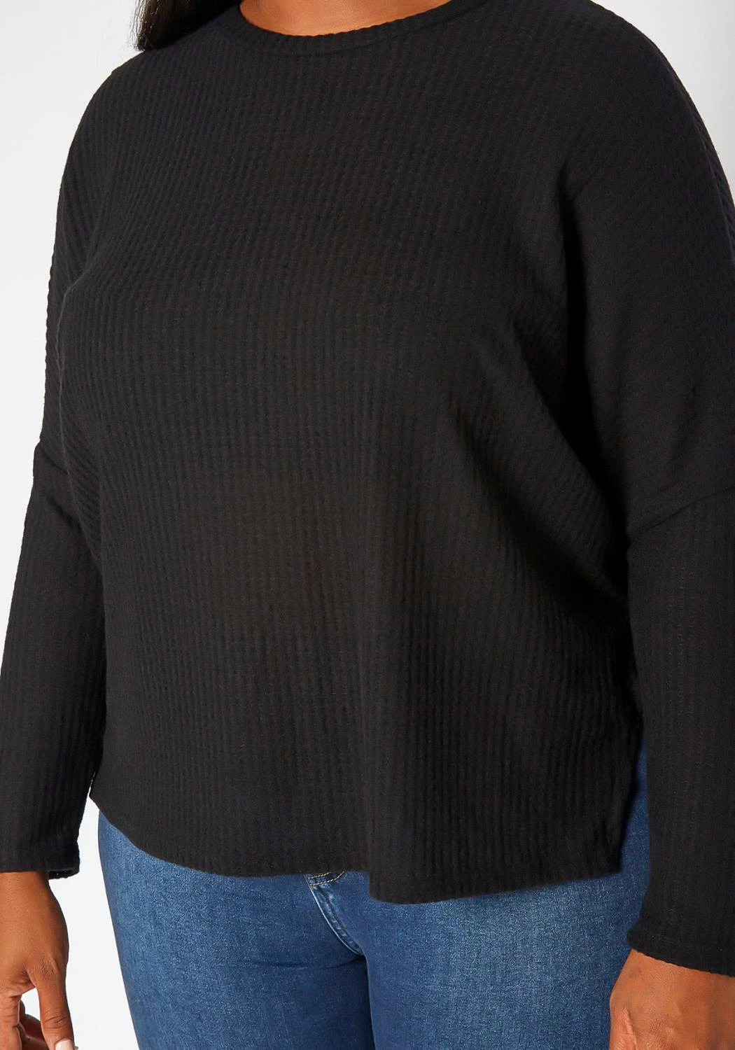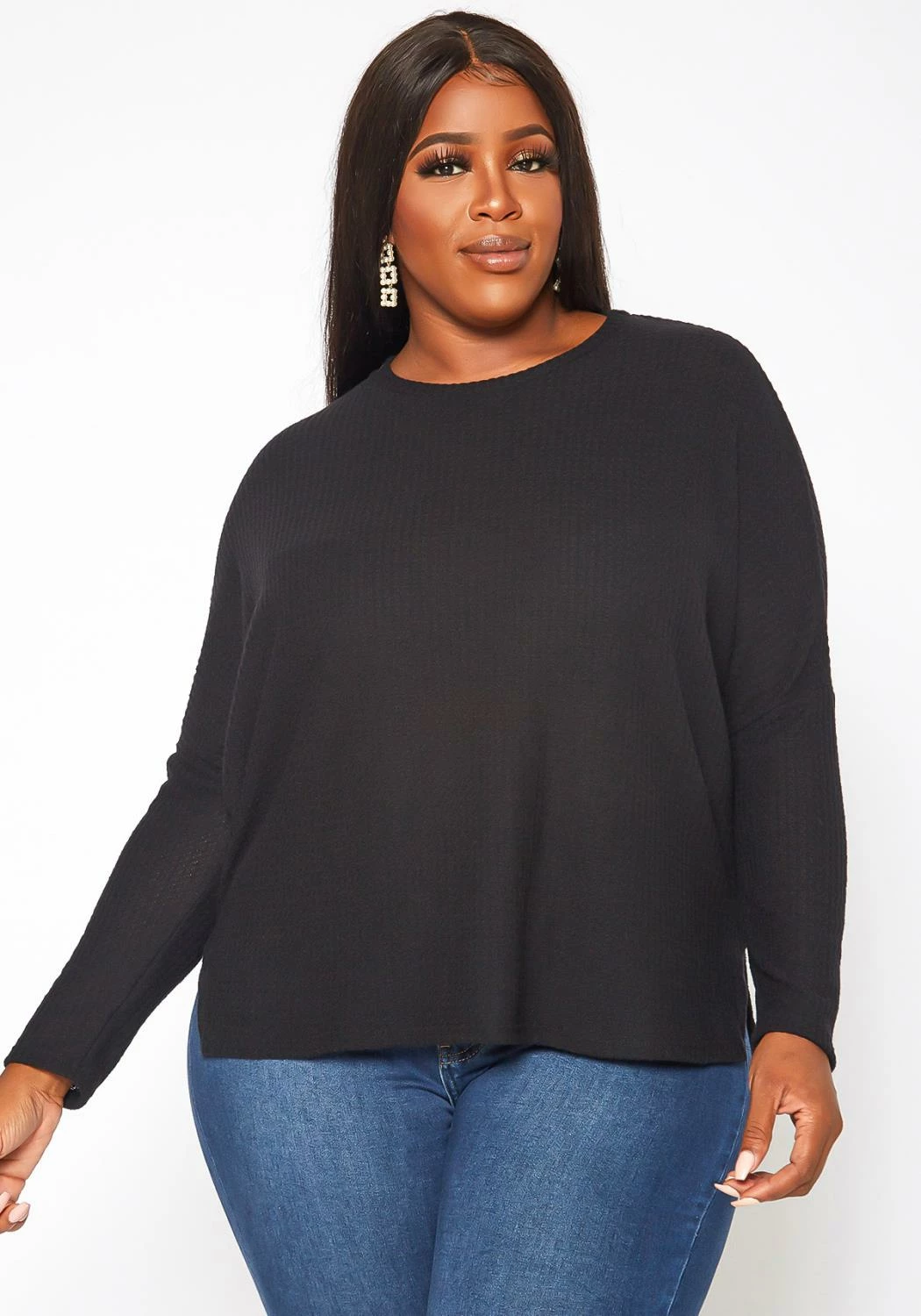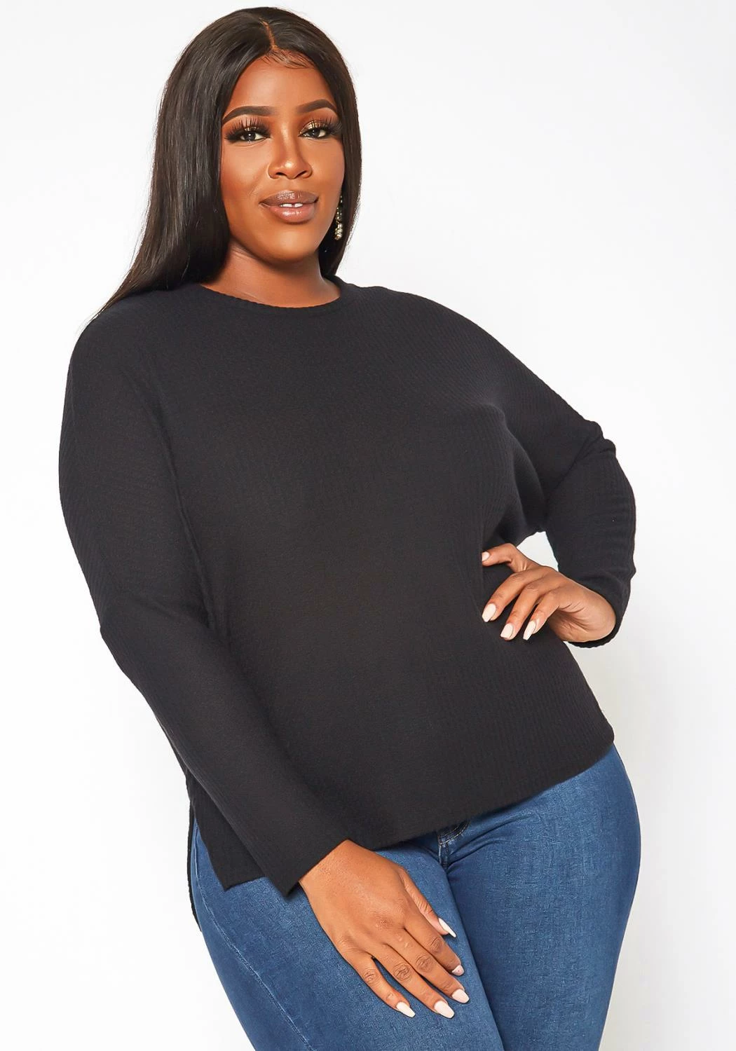 Plus size women’s waffle knit sweater in solid color, crew neck style, side slit hem and fitted long sleeves.