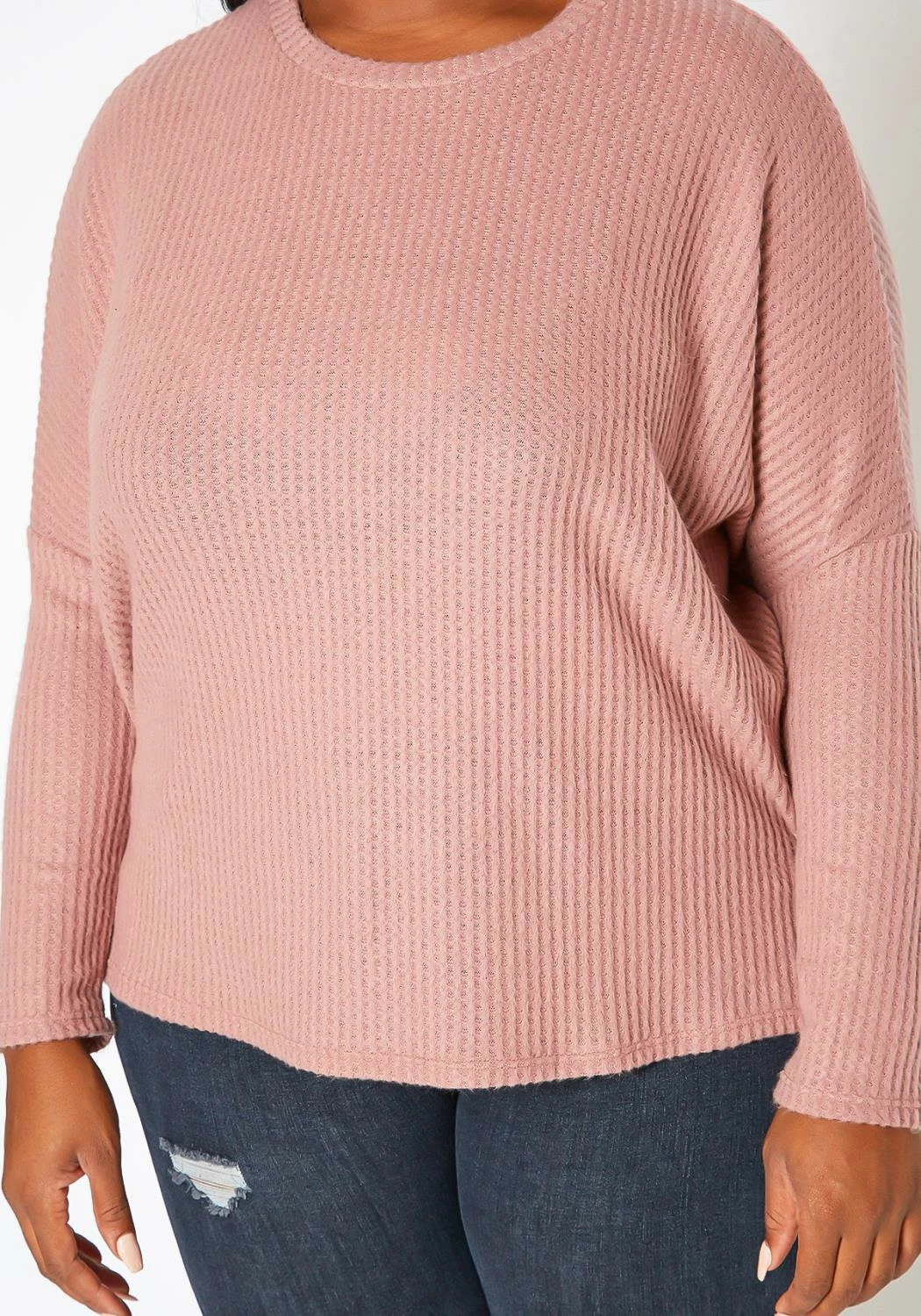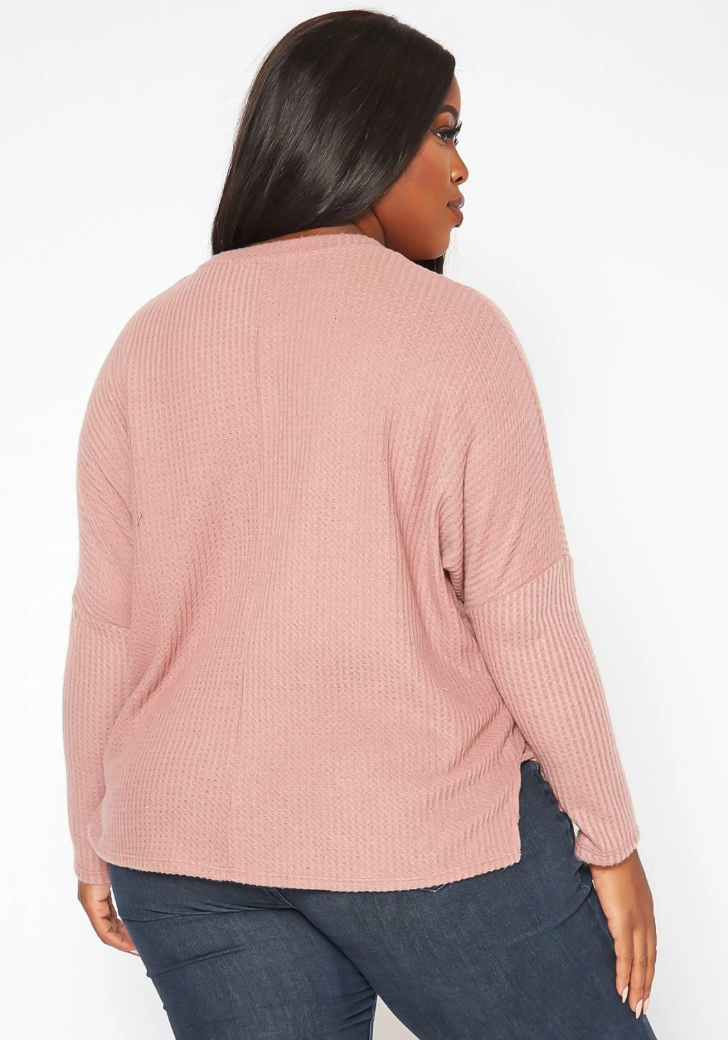Plus size women’s waffle knit sweater in solid color, crew neck style, side slit hem and fitted long sleeves.
