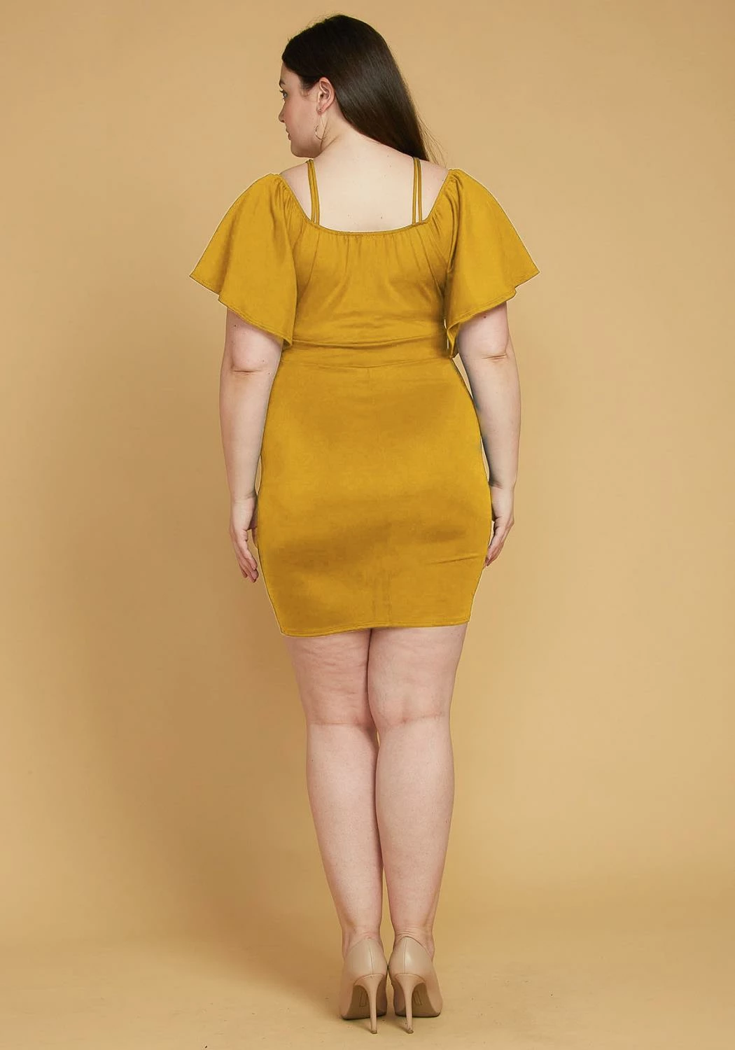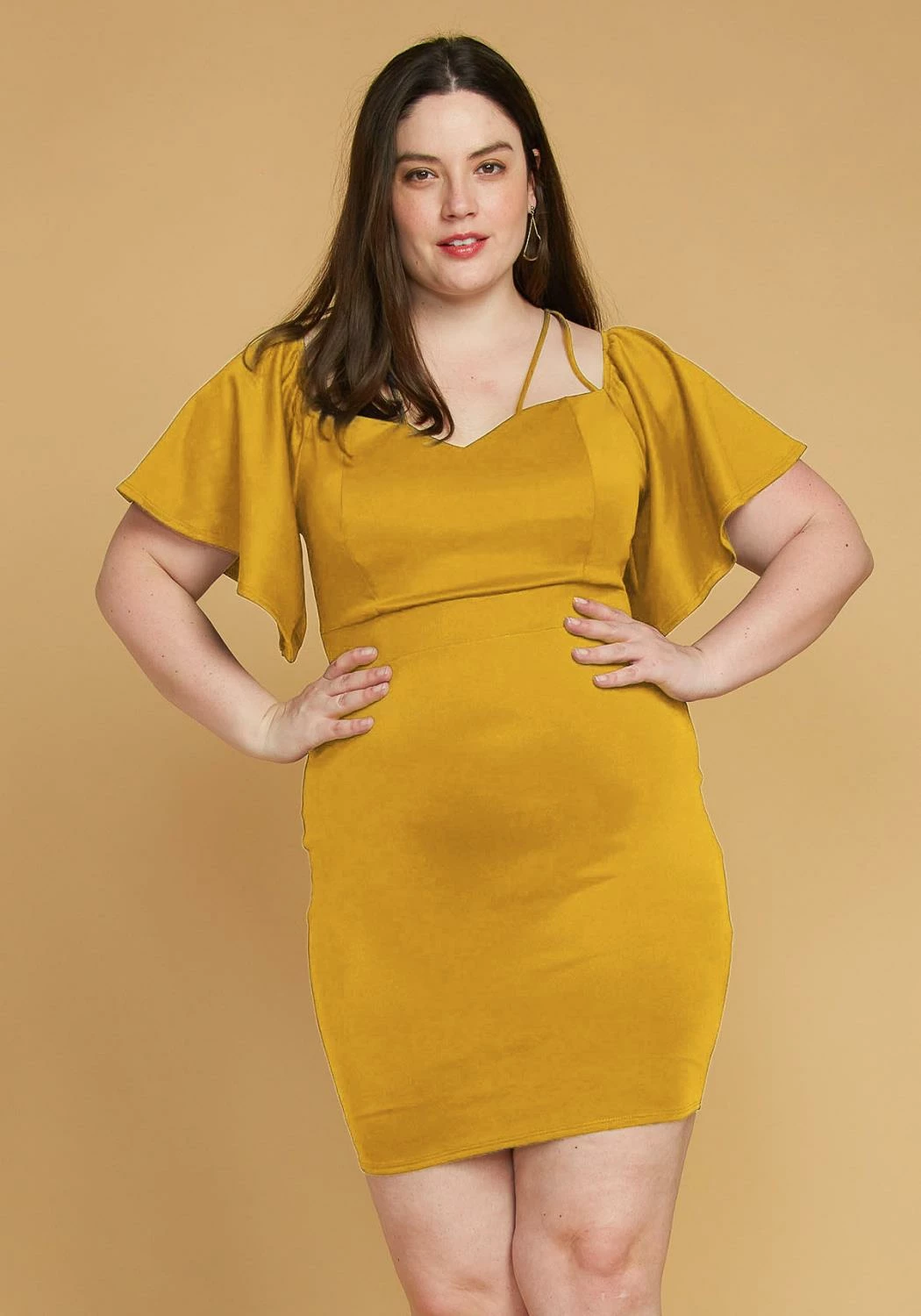 A sexy cocktail dress with bell sleeves, sweatheart neckline, and spaghetti straps detail.