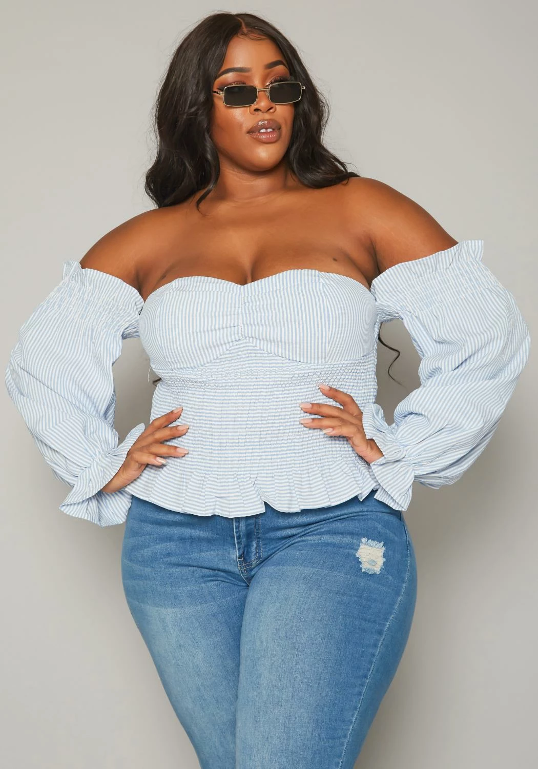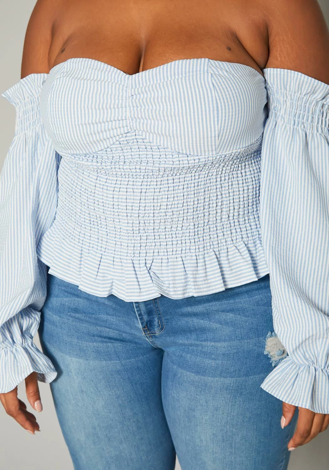 Lovely plus size women’s smocked top in pin striped pattern, off shoulder style, balloon long sleeves, flared wrist cuffs and linen material.