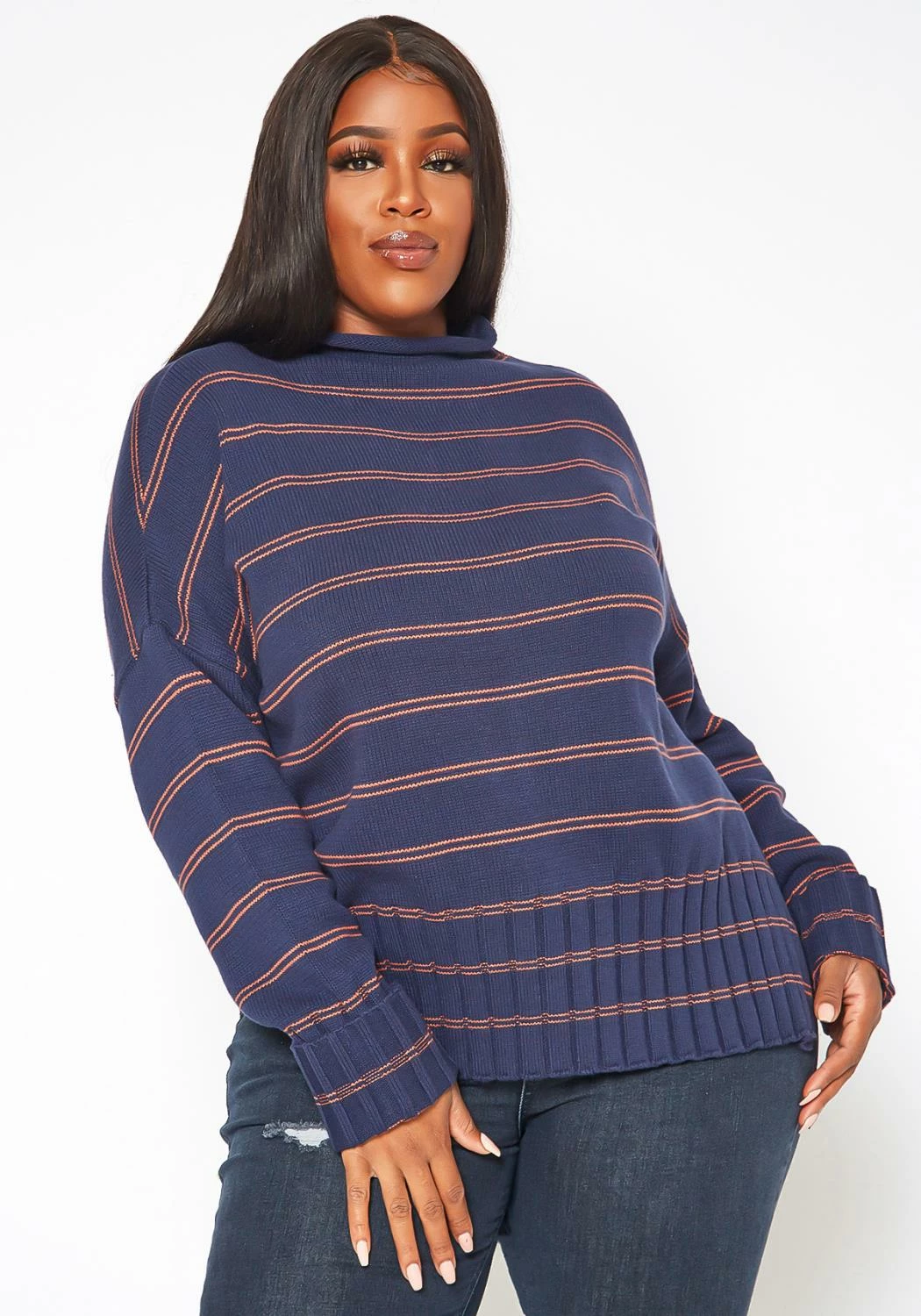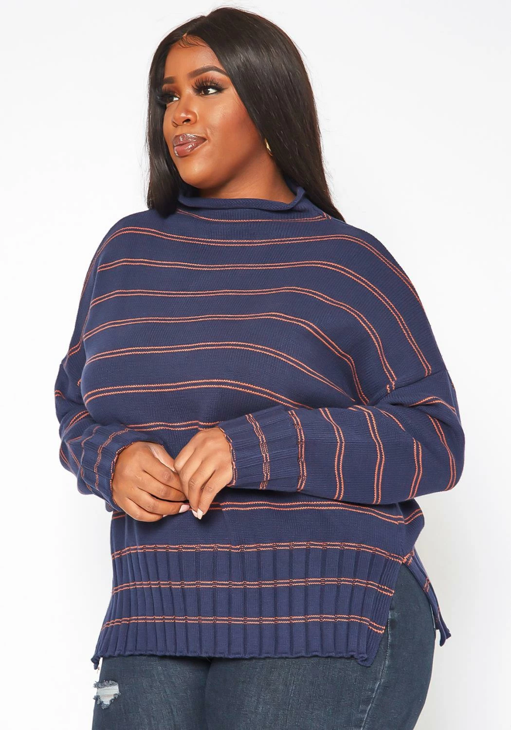 Fall season essential knit sweater in striped print, high neck style, drop shoulder long sleeves and side slit hem.