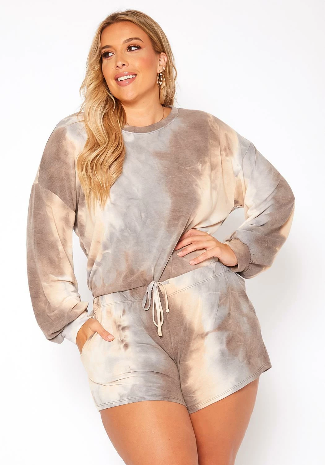 Stylish lounge set in tie dye print for plus size women. Features a soft, relaxed fit sweater and waistline drawstring hem shorts with pockets.