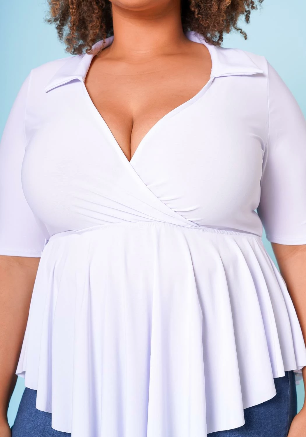 Plus size women’s top, featuring a surplice neck hem, collar style, short sleeves, peplum design with asymmetrical ascent.