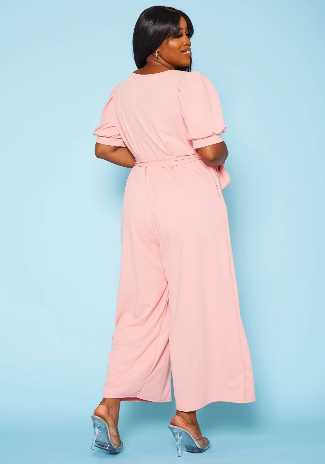 Plus size women’s jumpsuit, featuring a surplice neck hem, short cuff hem sleeves, wide leg hem & detachable waist tie up belt.