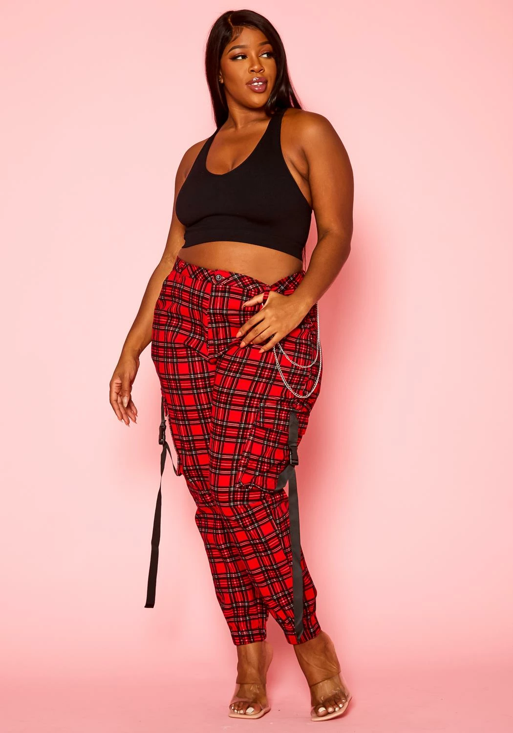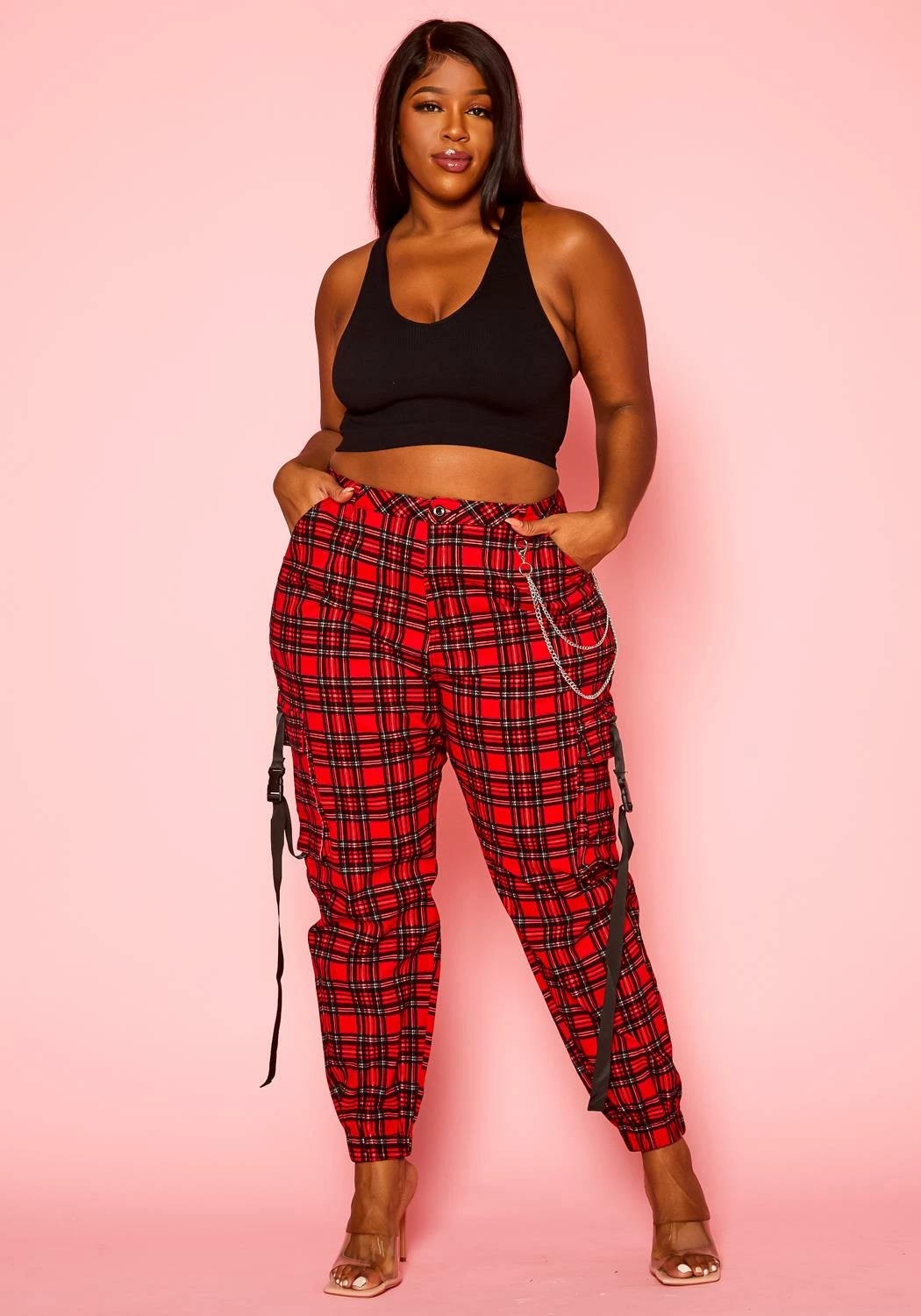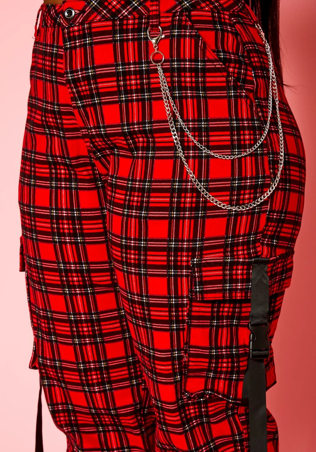 Plus size women’s staple cargo pants in tartan plaid pattern, high waist style, silver chain ascent, pockets and ankle cuff hem.