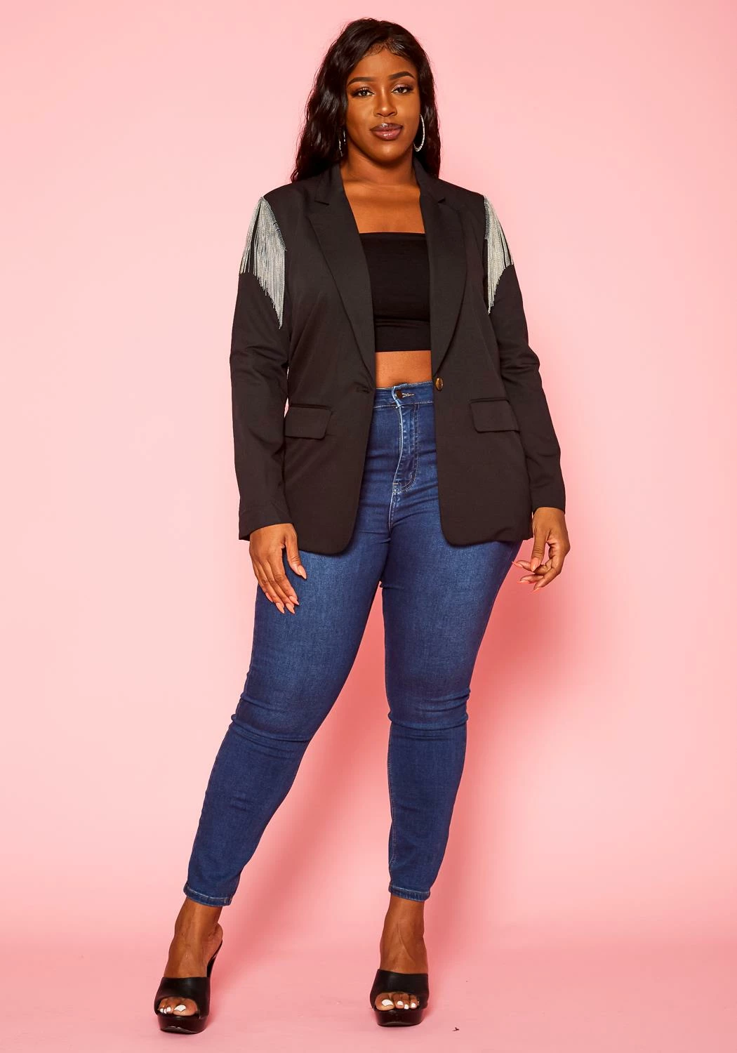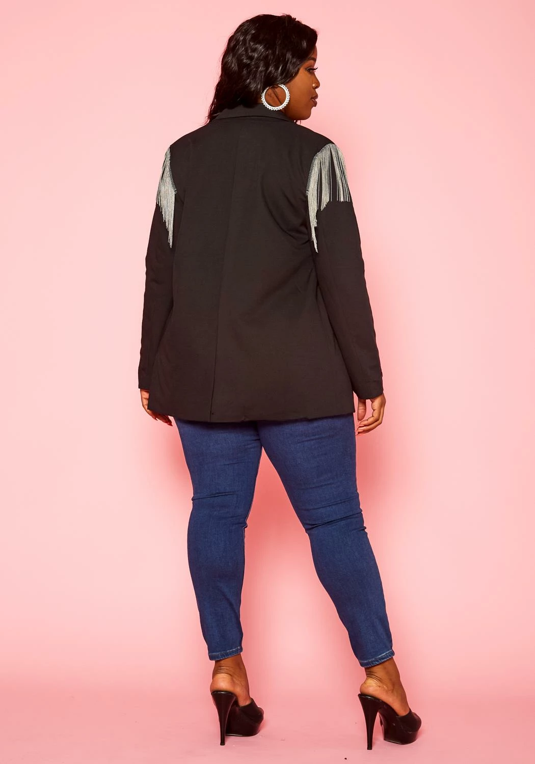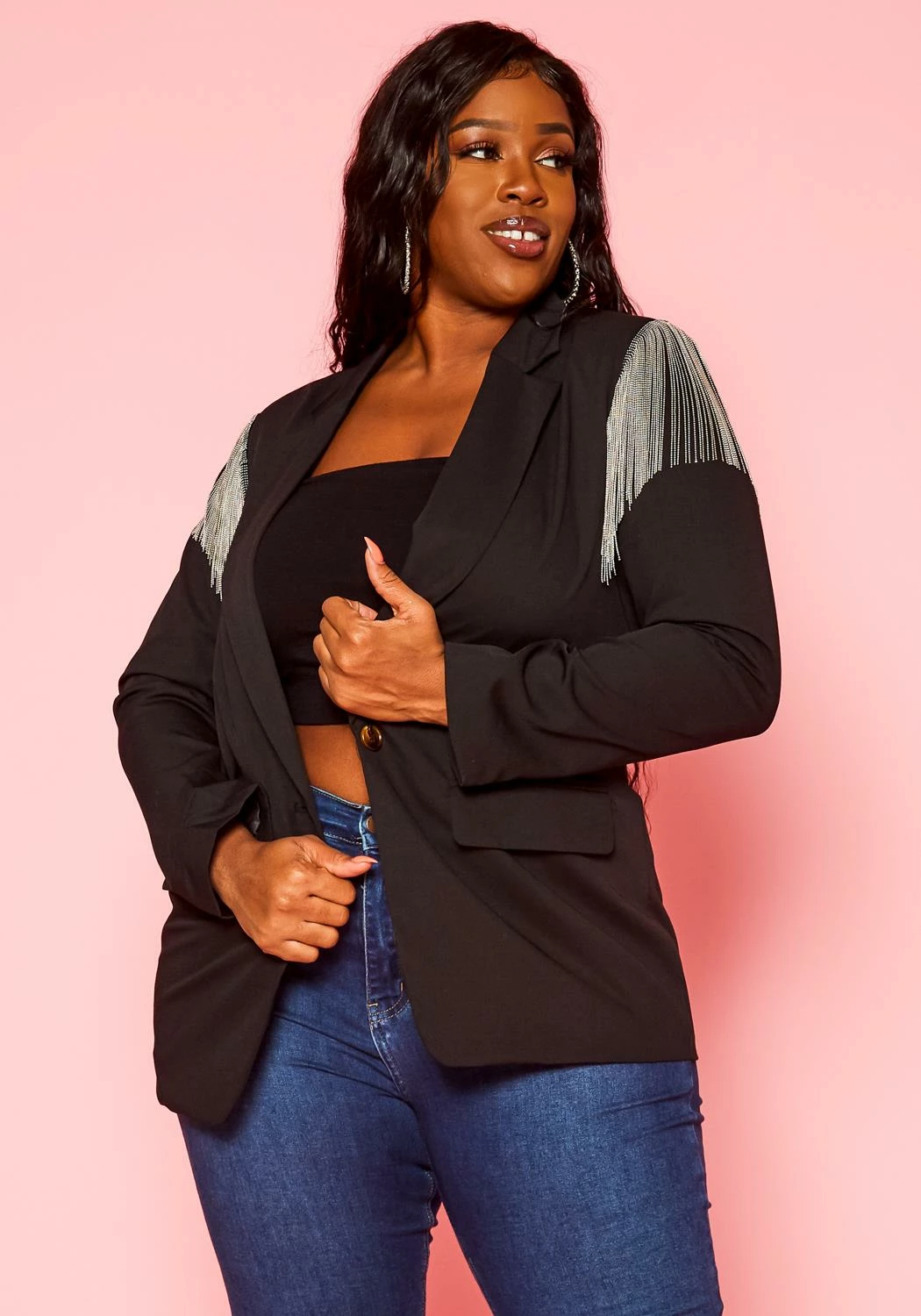 Plus size women’s business suited notch collar blazer with tassel shoulder details, button front closure and faux pocket hem.