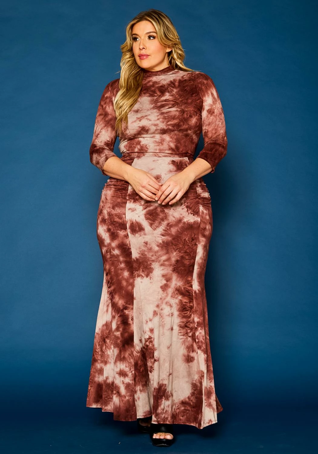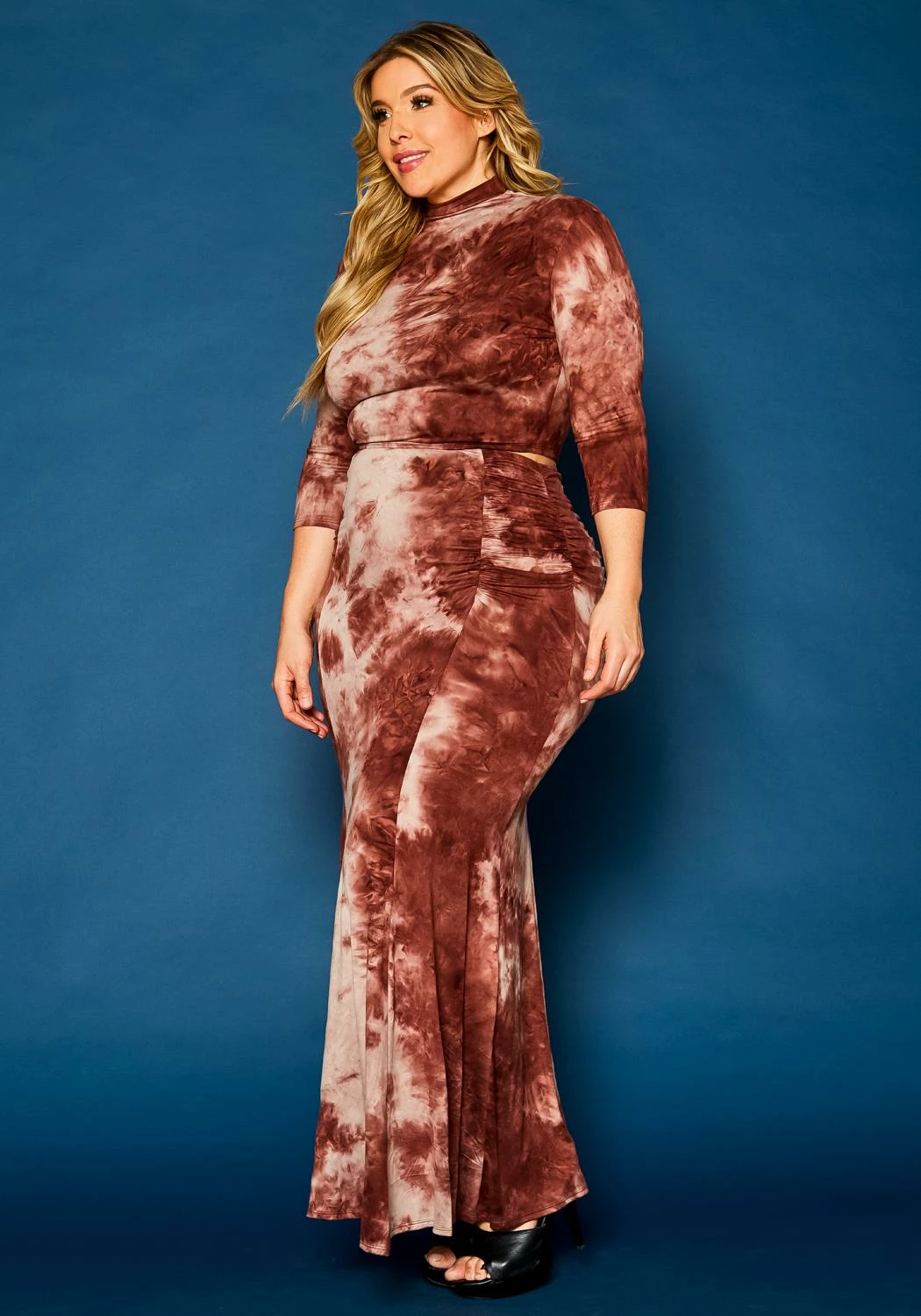 Attention grabbing plus size women’s matching set which features a mock neck, half sleeve, crop top and high waist mermaid flare maxi skirt.