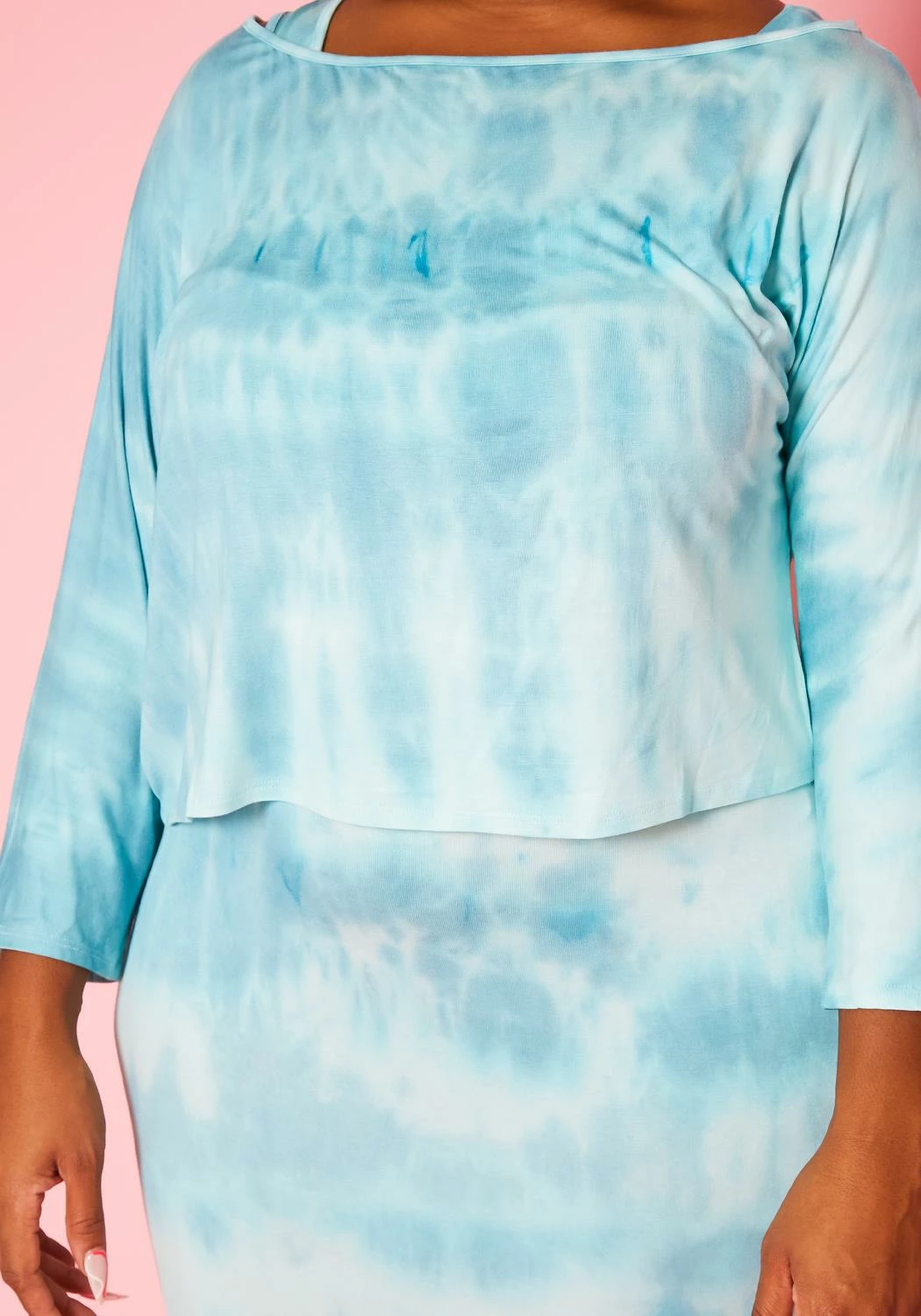 A comfortably stylish plus size women set which features an aqua tie dye sweatshirt that can be worn over a tank midi dress for a more casual vibe.