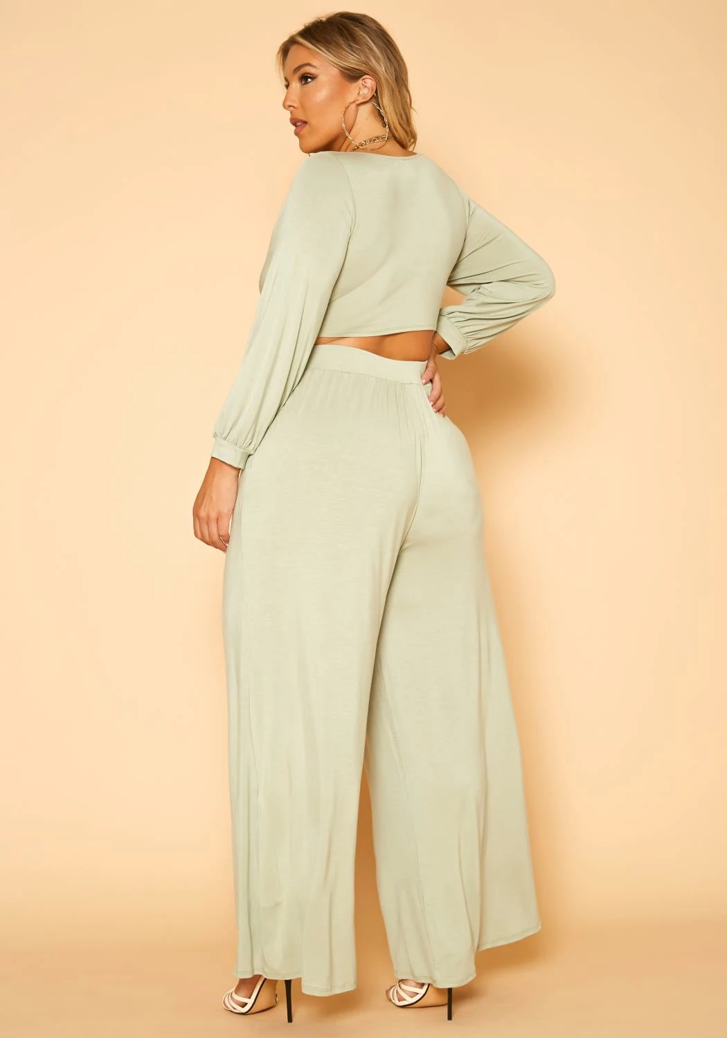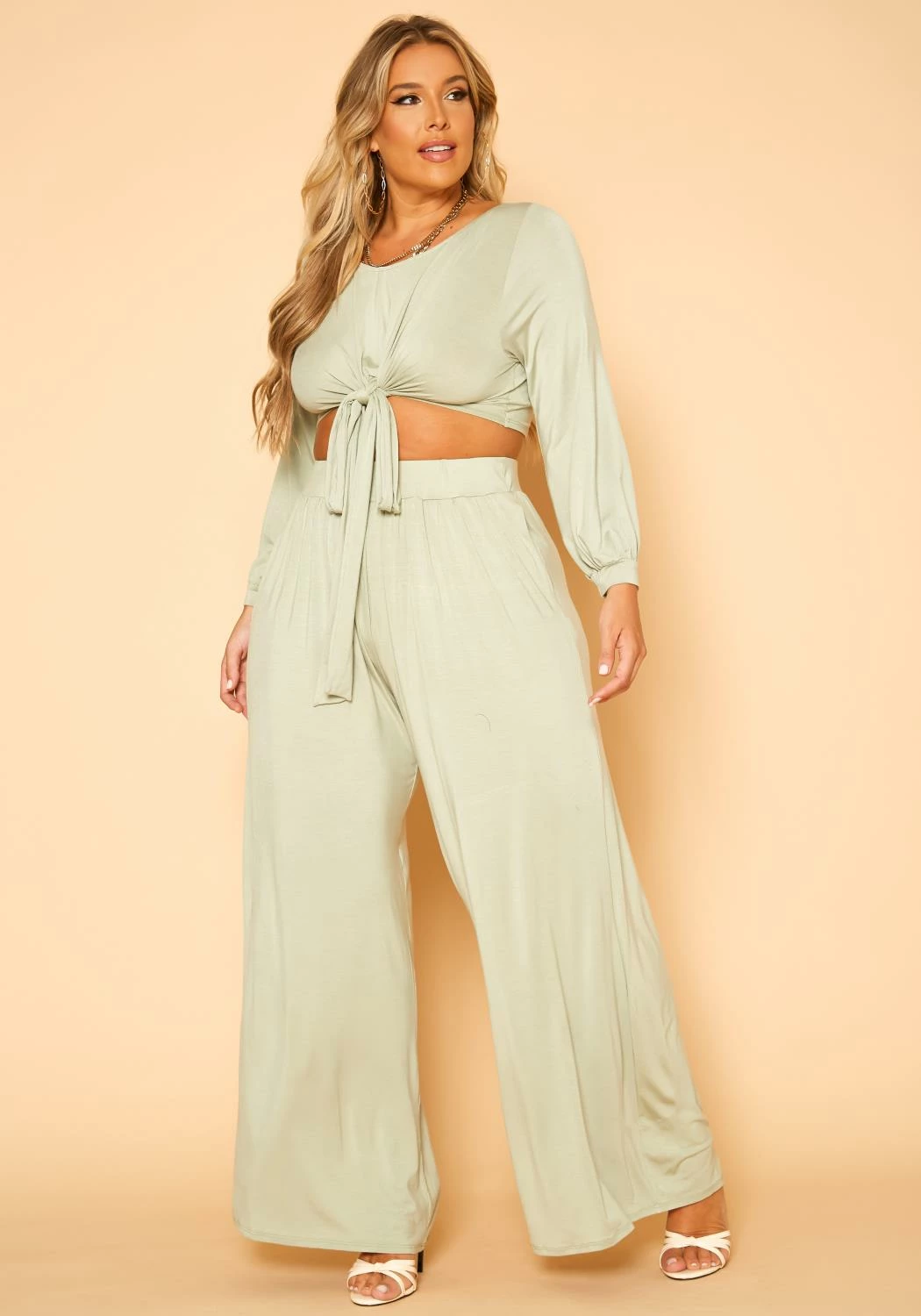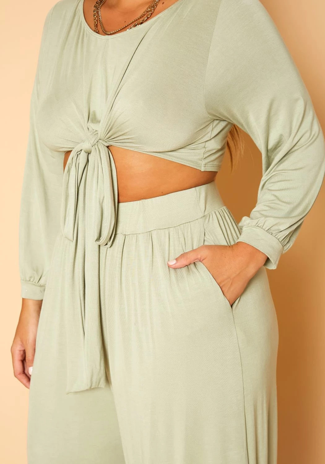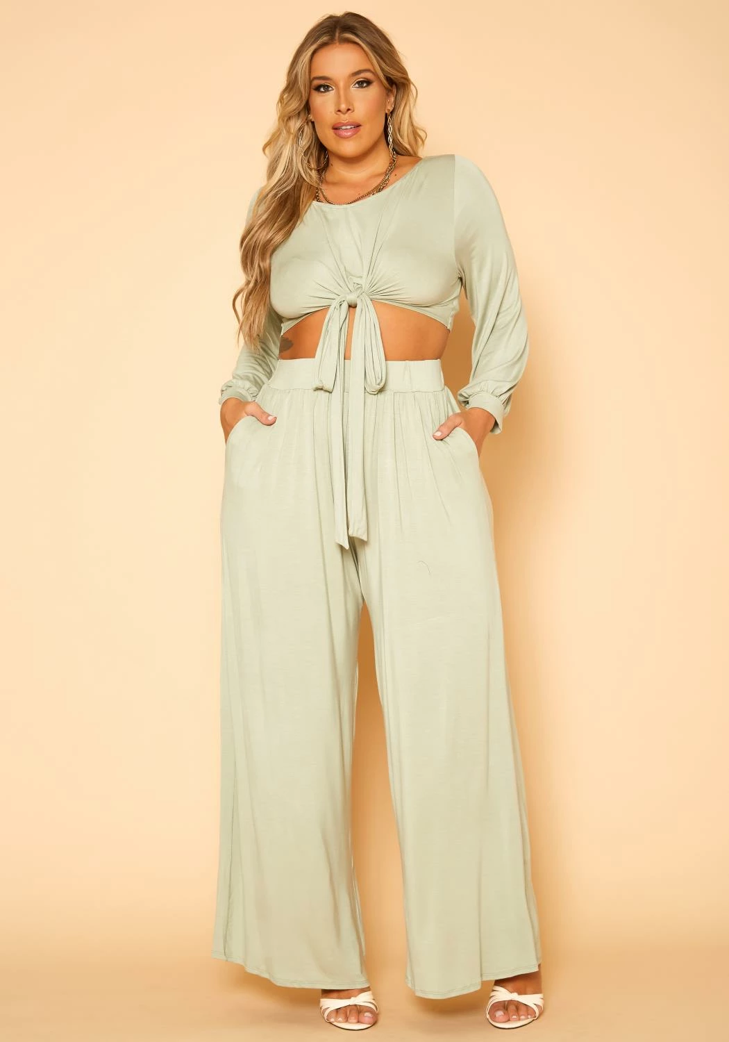 Effortless plus size women’s matching set with tie front, long sleeve, round neck style crop top and high waist style, pocket hem, wide leg pants.