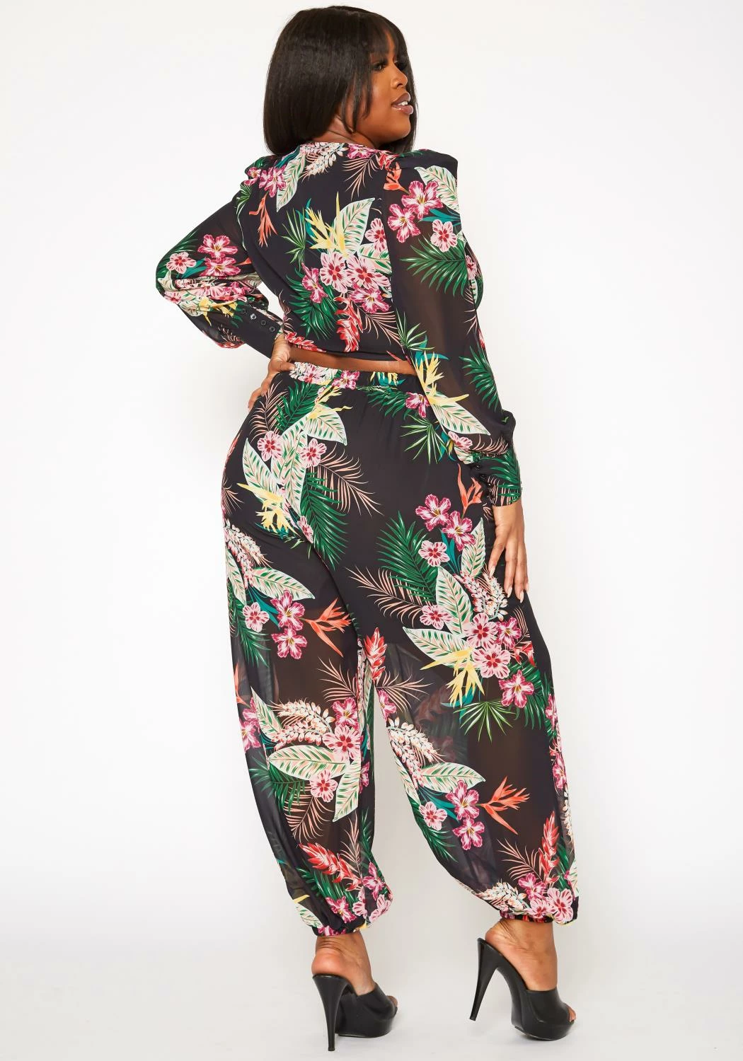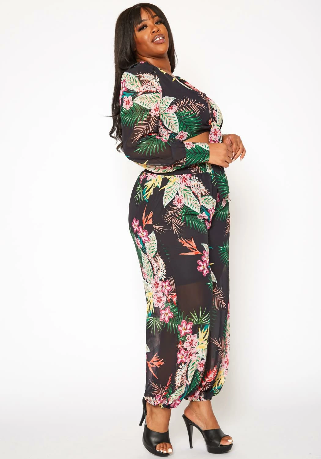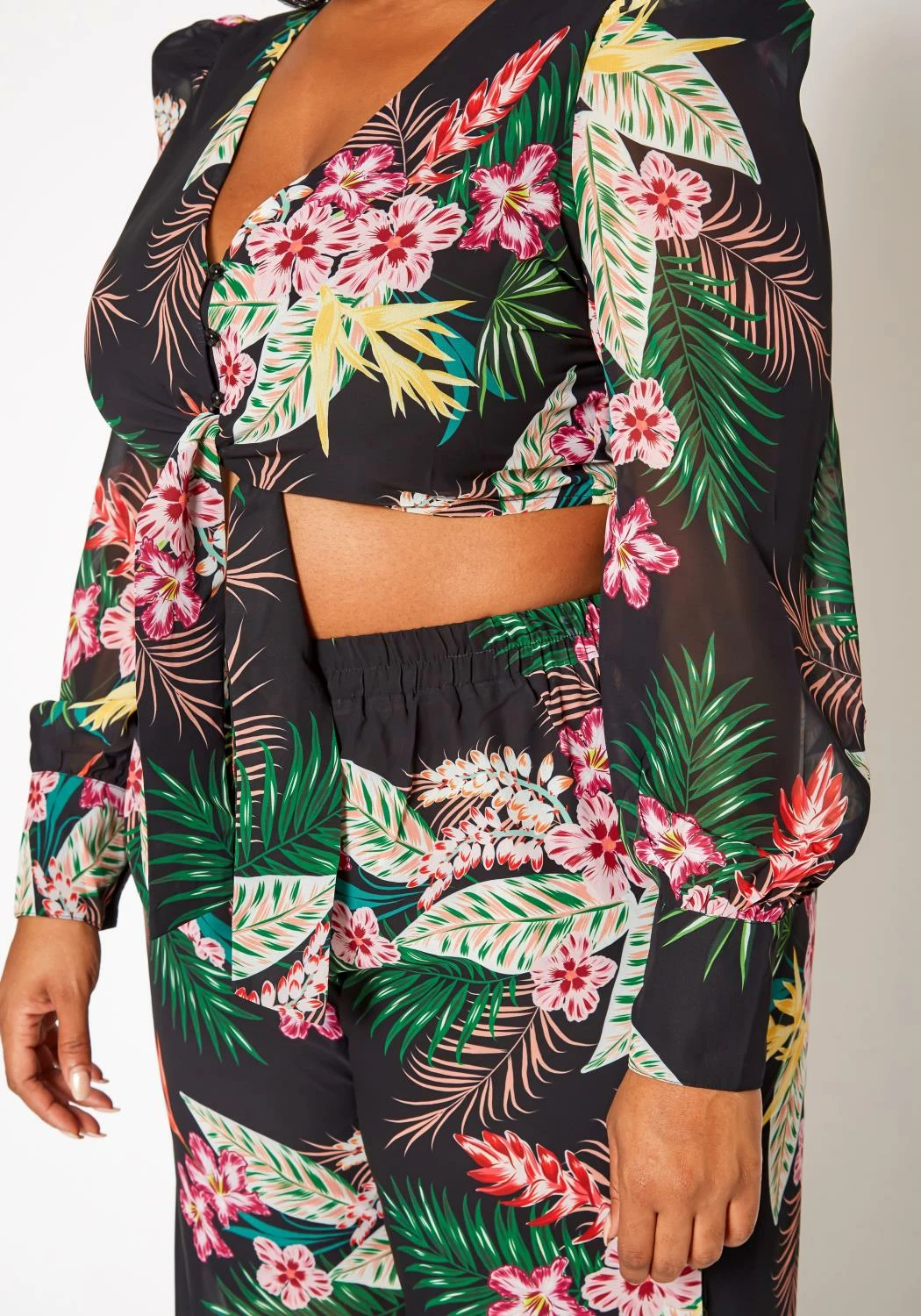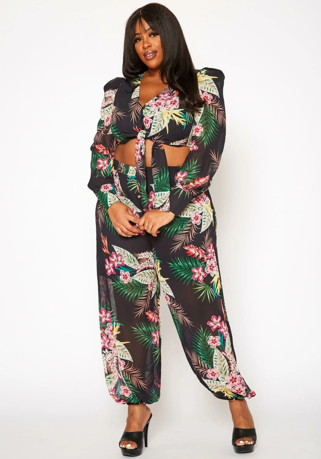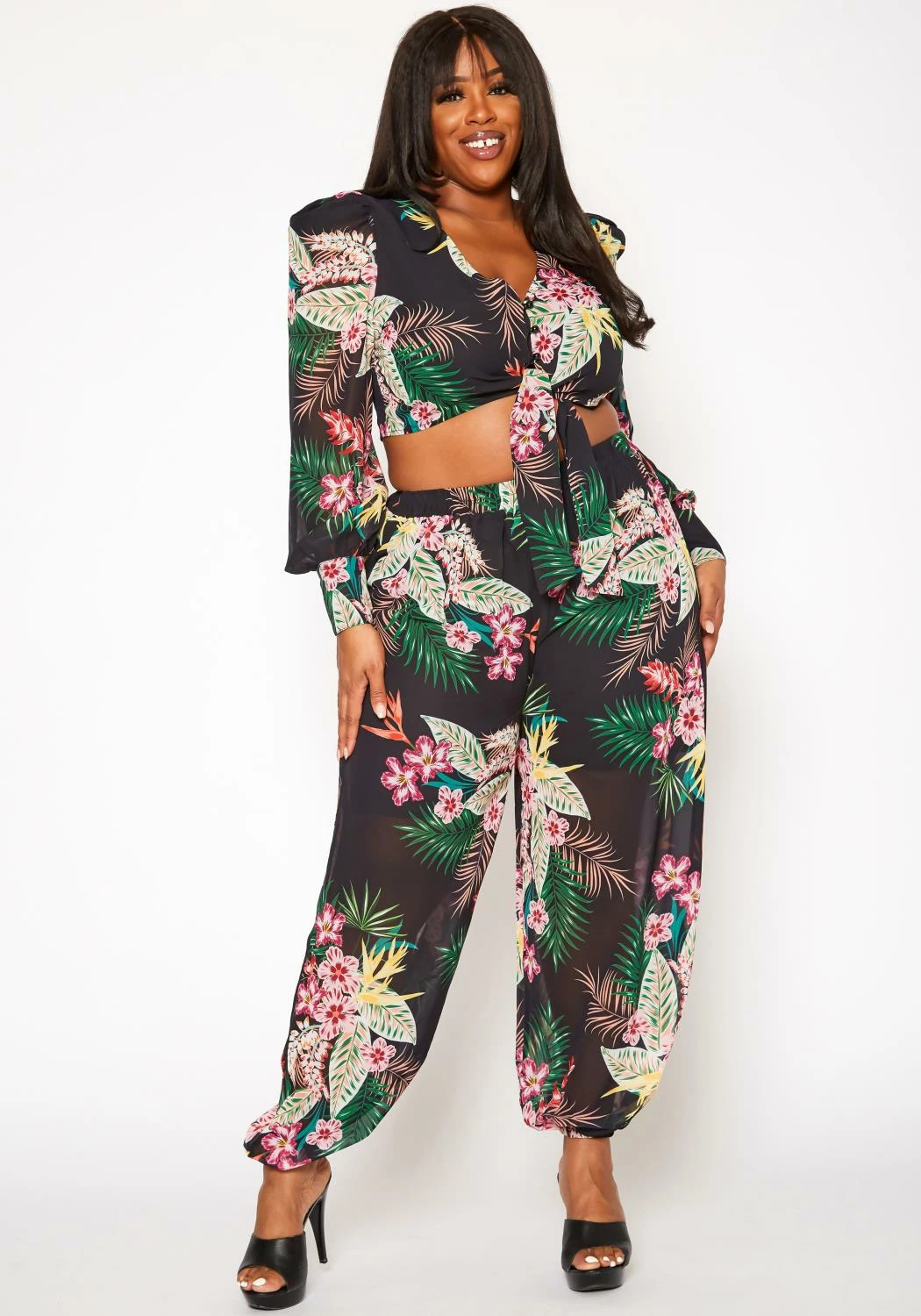 Gorgeous plus size women’s tropical print two piece set which features a long sleeve, v-neck style, tie front crop top and high waist pants.