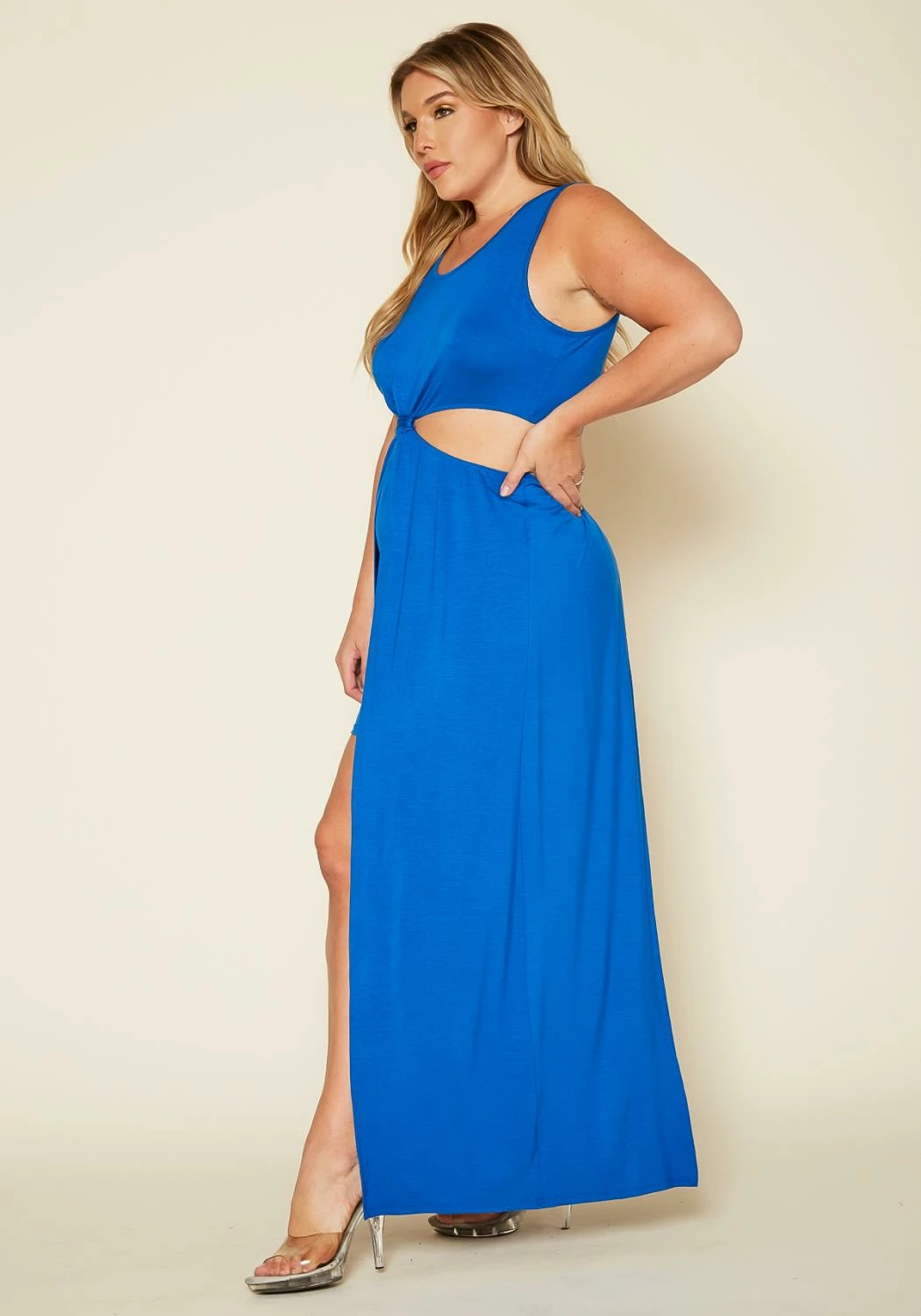 Effortless summer dress for plus size women in sleeveless style, twist hem ascent, cut-out detail, overlay flare hem and bottom lining.