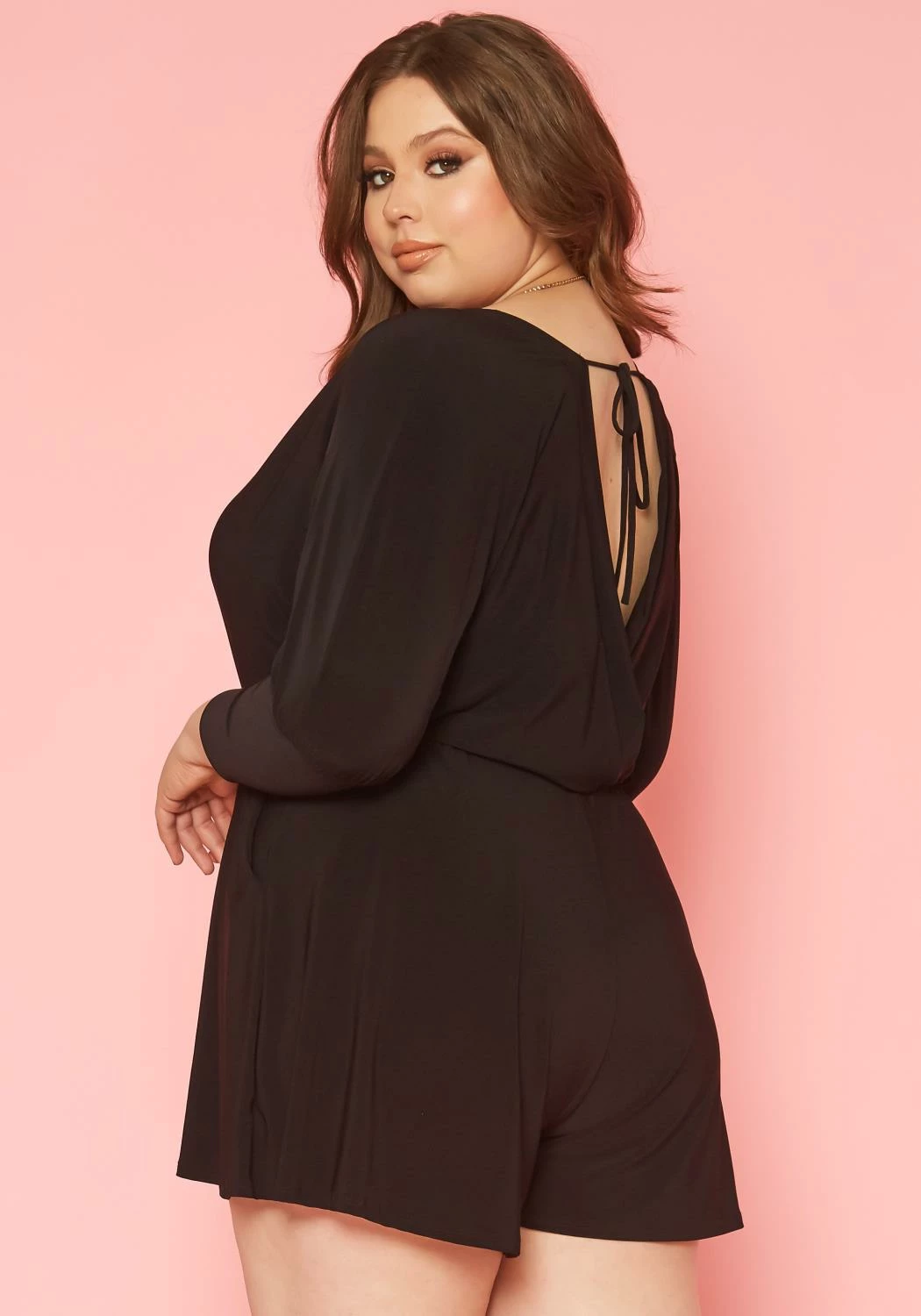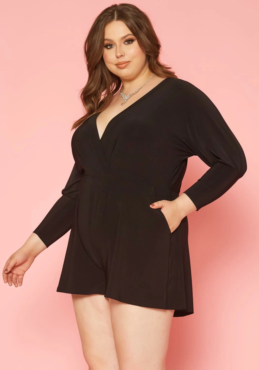 Effortless plus size women’s romper in v-neck style, dolman fitted long sleeves and pocket hem.