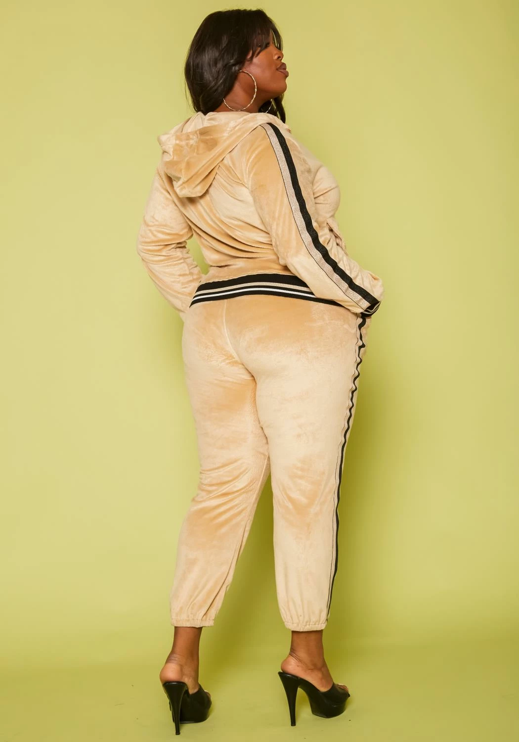 Trendy plus size women’s velvet tracksuit which features a zip front hooded sweater with golden varsity stripe and matching jogger pants.