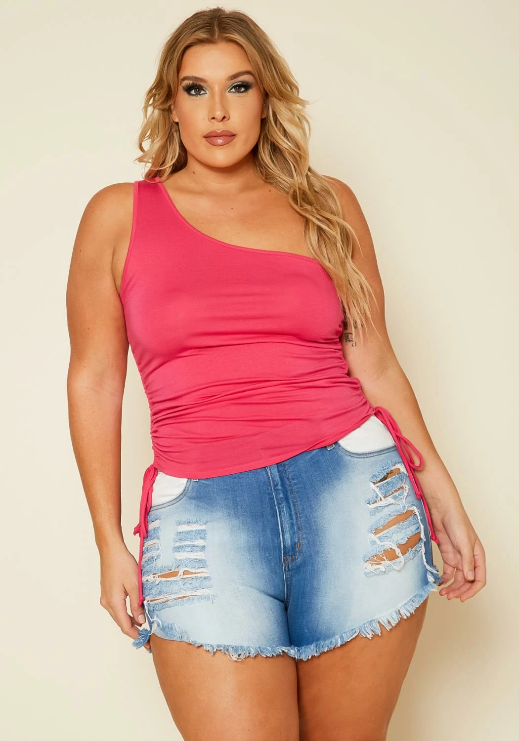 Plus size women’s shorts in denim style featuring a distressed detail with front white faux pockets and back white pockets.