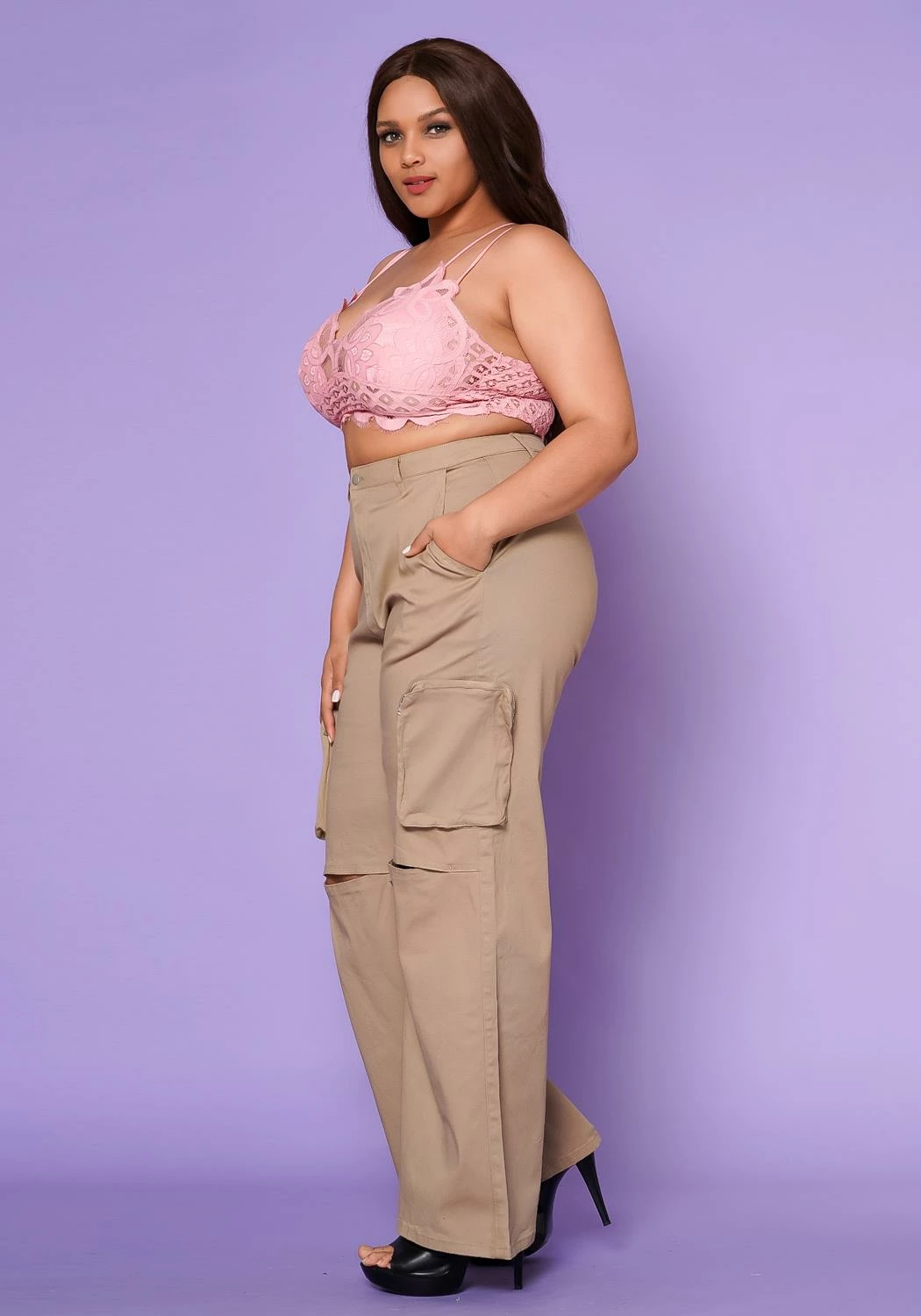 Trendy plus size women’s wide leg utility cargo pants featuring pocket hem, knee slit detail, belt loop holes and high rise fit.