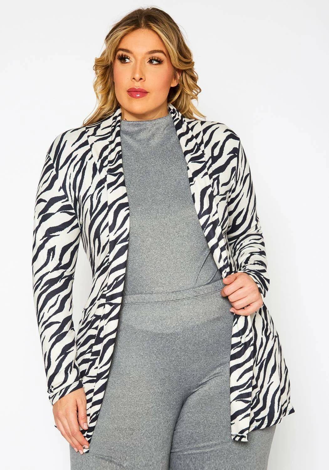 Casual plus size women’s soft knit cardigan in zebra pattern, fitted long sleeves and open front style.