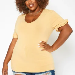 Asoph Plus Size Ruffle Trim V Neck Tee Shirt
