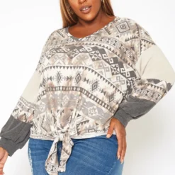 Plus Size Aztec Print Tie Front Sweater