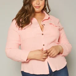 Plus Size Collar Neck Puff Sleeve Linen Shirt