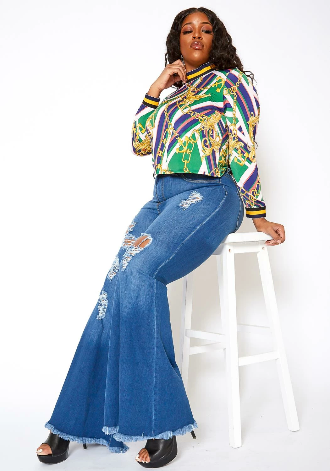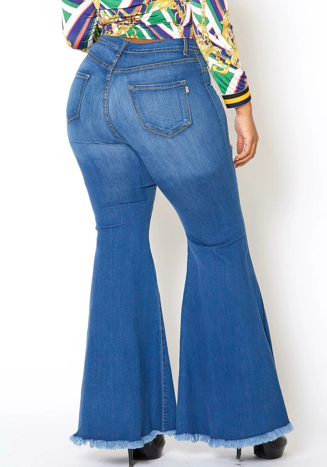 Asoph x Vibrant plus size denim high waisted jeans with bell bottom design, frayed hem detail, front distress hems, belt loop holes and pockets.
