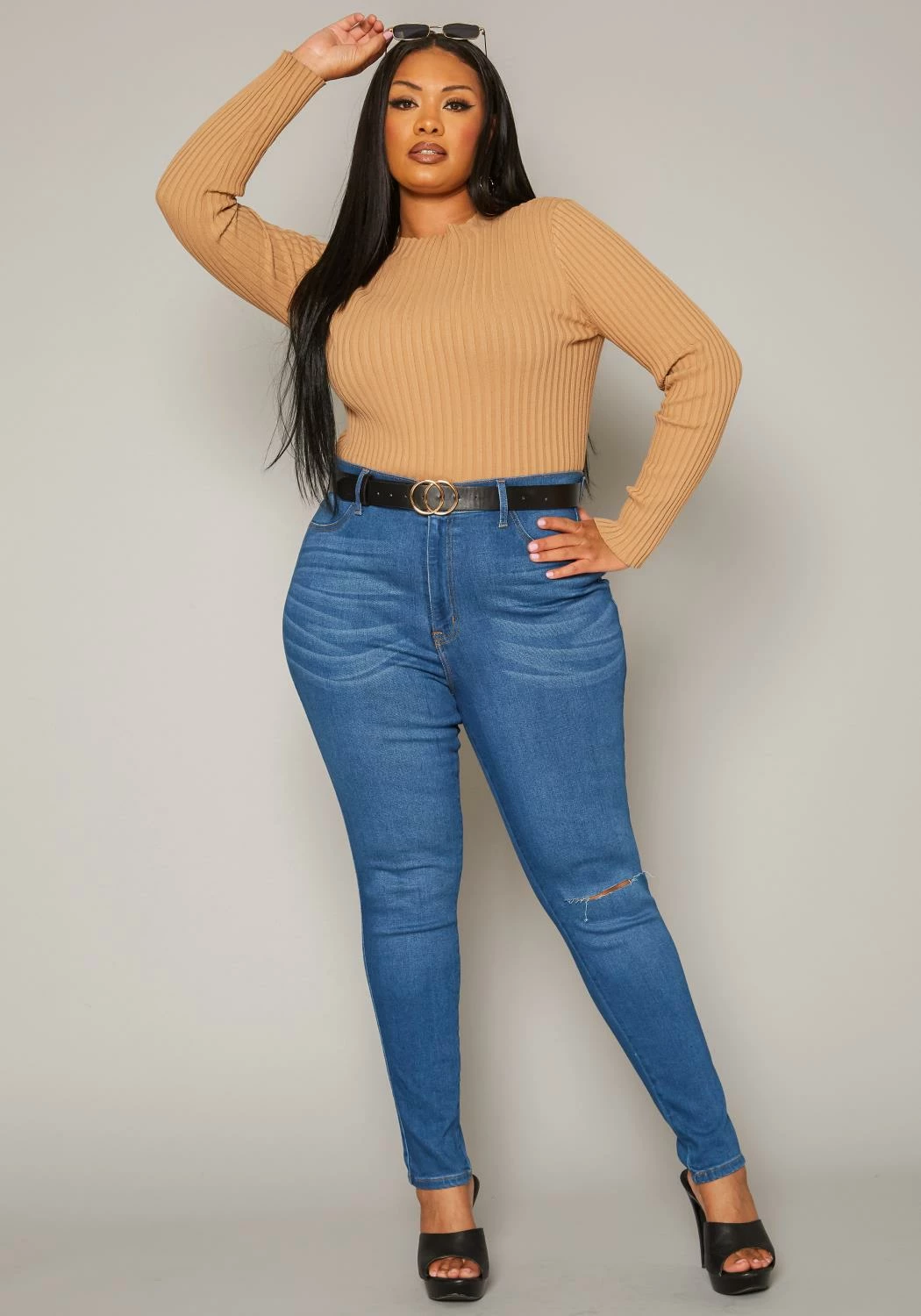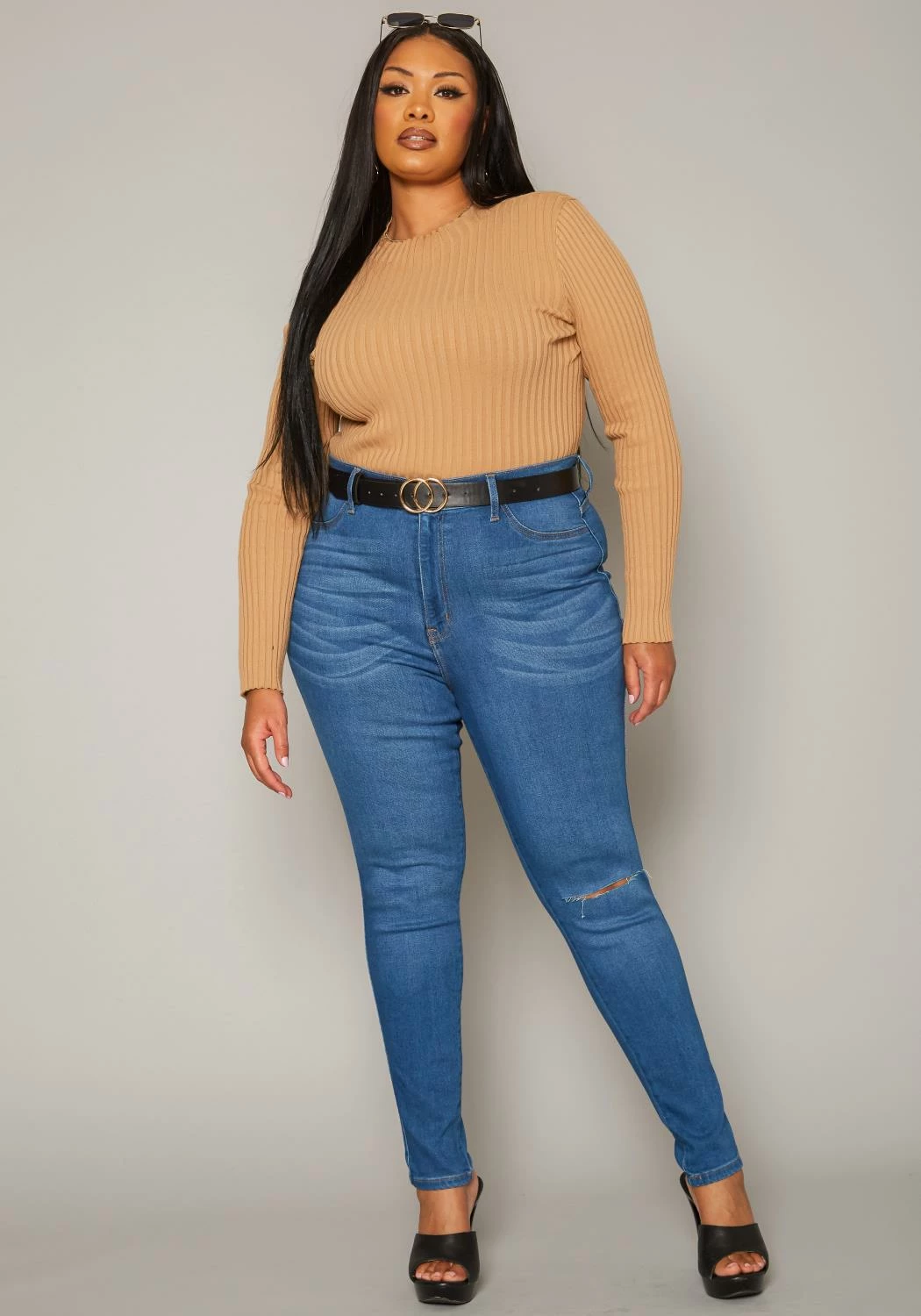 Asoph x Vibrant plus size women’s skinny mid rise denim jeans plus featuring a classic knee rip hem, belt loop holes and pockets.