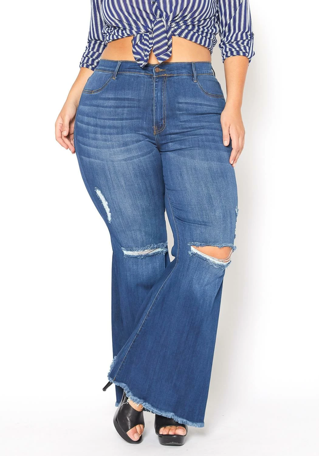 Asoph x Vibrant plus size women’s bold flared bell bottom high waist jean which features a raw cut end hem, knee distress, belt loop holes and pockets.