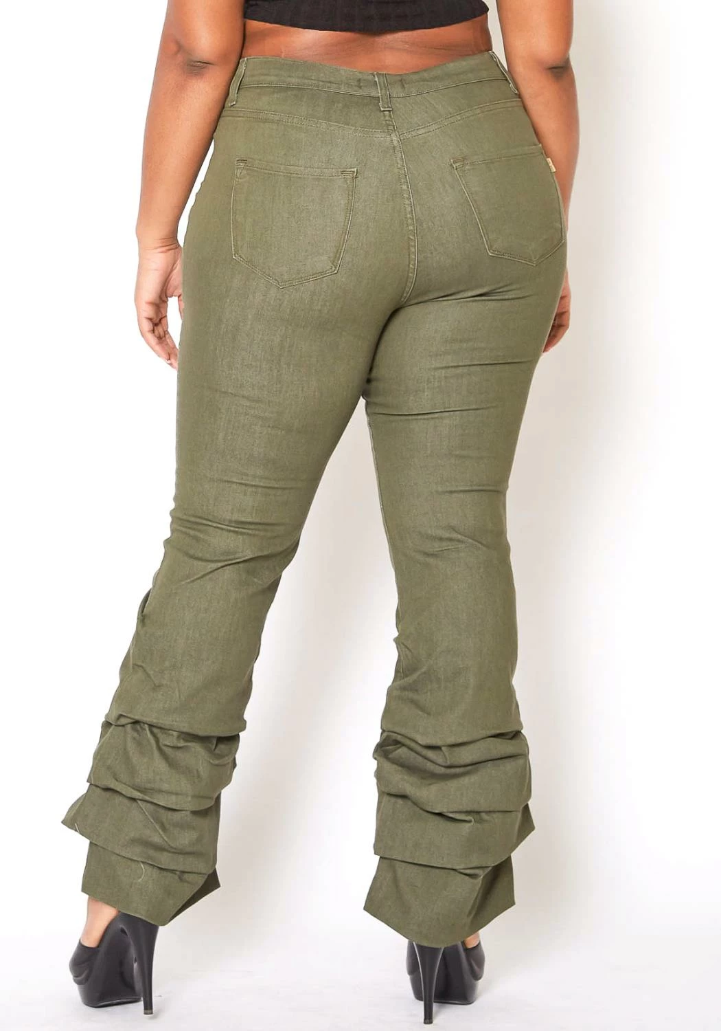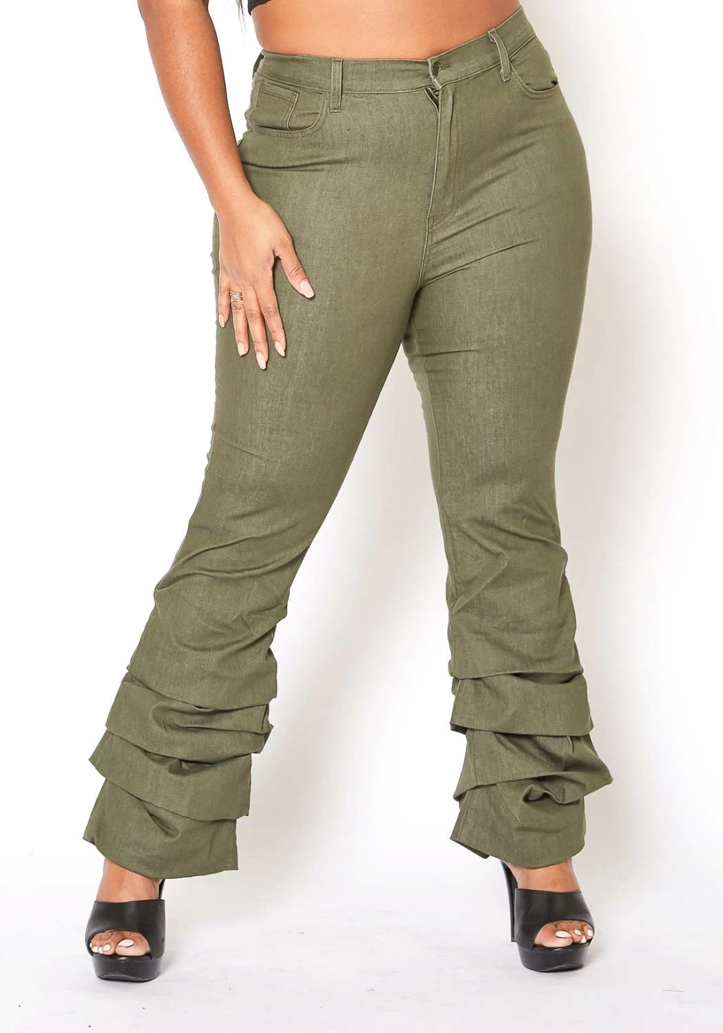 Asoph x Vibrant plus size women’s olive jean with unique ankle scrunched gather hem for a flattering chic style. Contains pockets and belt loop holes.